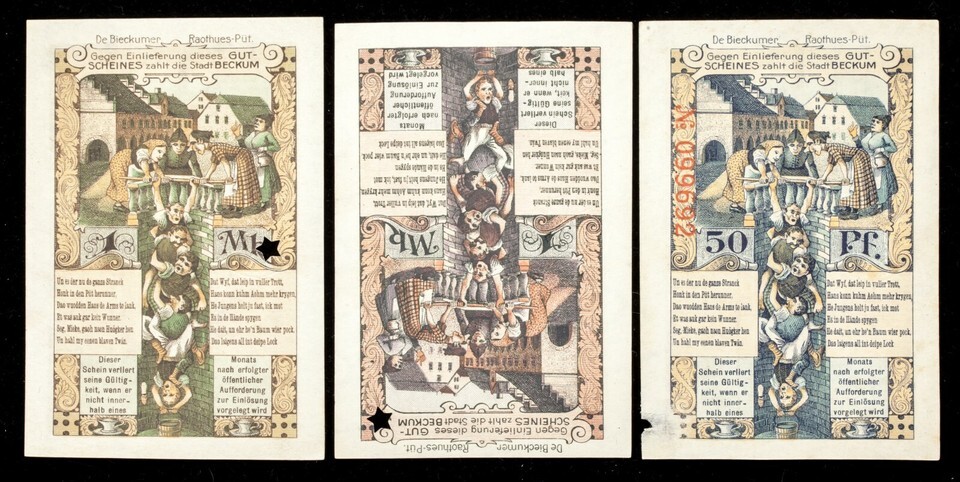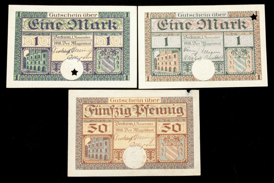 1918 Notgeld Money Error Note - 3pc Set from Beckum, Germany Alignment error