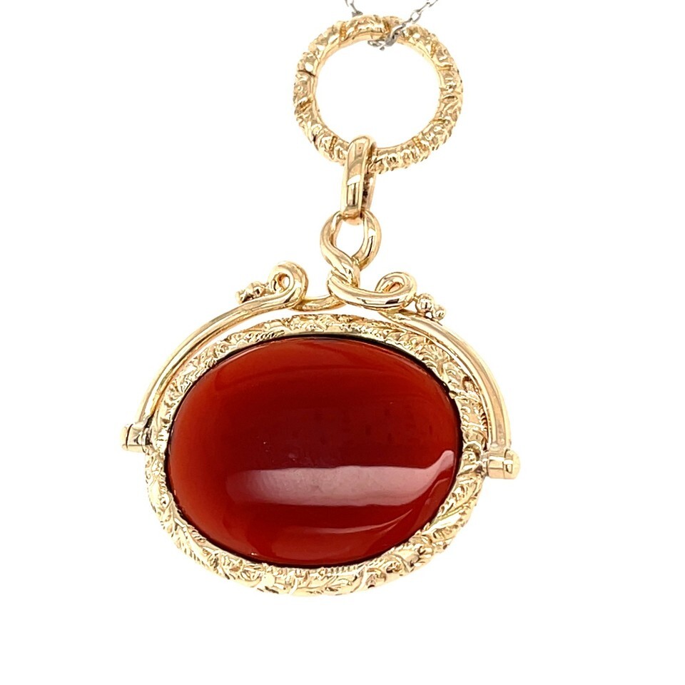 Elegant vintage pendant/watch fob featuring a deep red-brown oval carnelian set in a rotating gold frame.