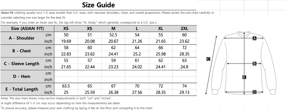 Asian Fit refers to clothing tailored for body shapes commonly found in Asian populations. These items typically run 1-2 sizes smaller than U.S. sizes, with narrower shoulders, chest, and overall proportions. Please check the size chart carefully or consider sizing up for the best fit.