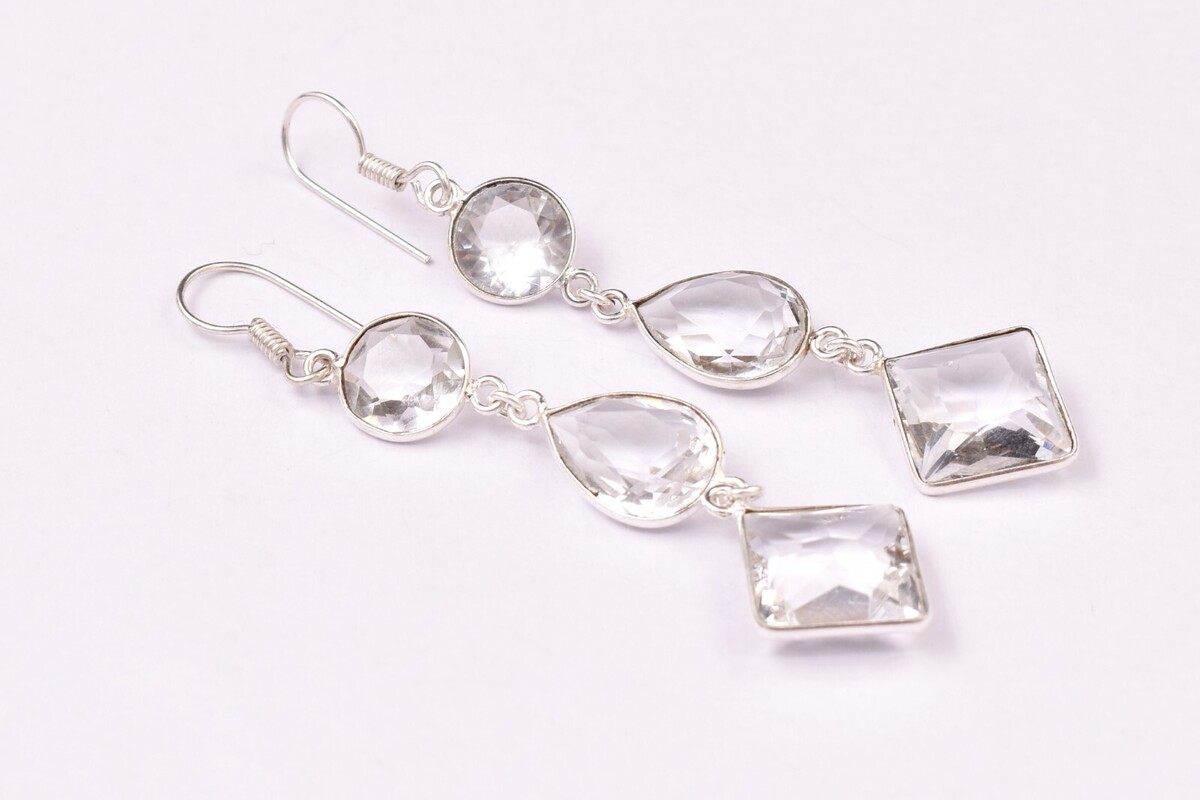 Sterling Silver 3 Pc Crystal Quartz Handmade Drop Dangle Minimal Earrings ES1461
