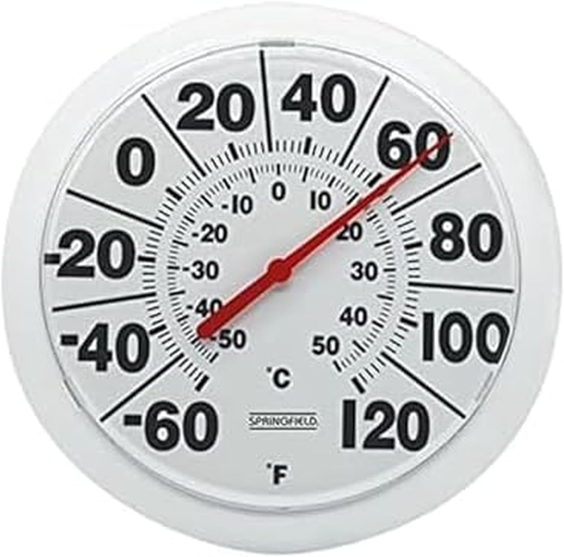 Check temperatures at a glance with the Springfield Indoor Outdoor Big and Bold Dial Thermometer. Featuring an 8-inch dial with large, easy-to-read numbers, this classic thermometer is ideal for patios, gardening, greenhouses, or kitchens. Its wireless design allows versatile placement?hang it inside or outside?while the weather-resistant construction withstands seasonal changes. The precise mercury-free gauge measures from ?40F to 120F, delivering accurate readings in all conditions. A built-in mounting hook lets you display it conveniently, and its white frame blends seamlessly with any decor. Whether you're monitoring outdoor conditions or tracking temperature-sensitive environments, the Springfield thermometer combines nostalgic style with reliable performance to keep you informed year-round.
