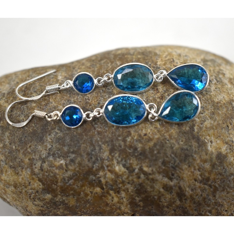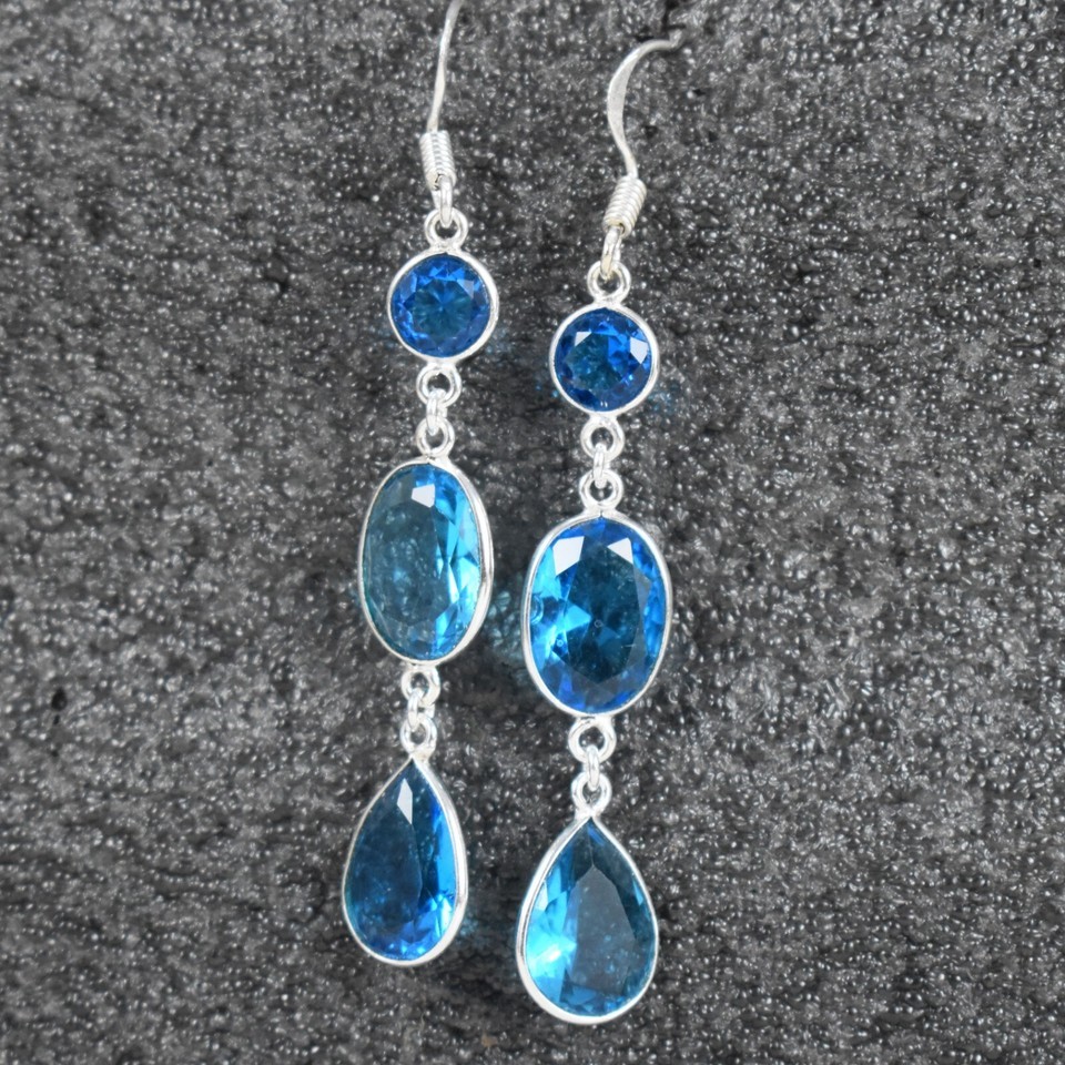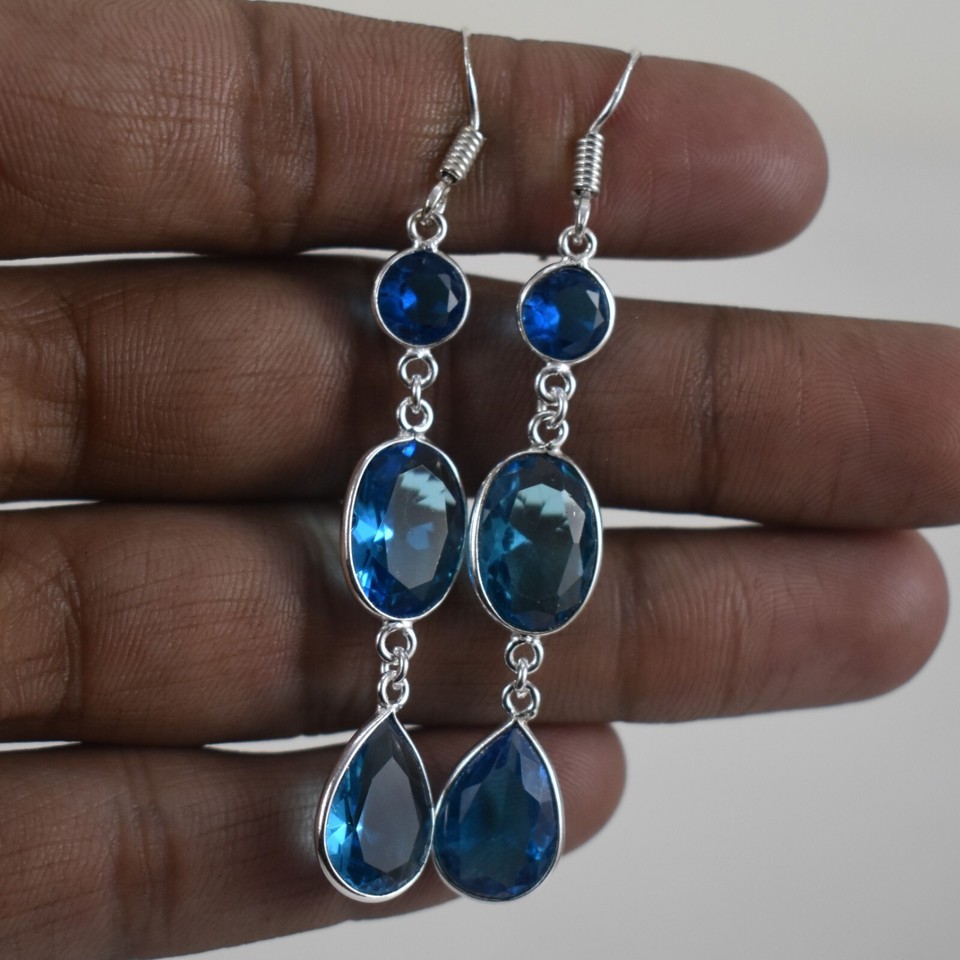 Handmade 925 Sterling Silver Blue Topaz Gemstone Dangle Drop Earrings Women Gift