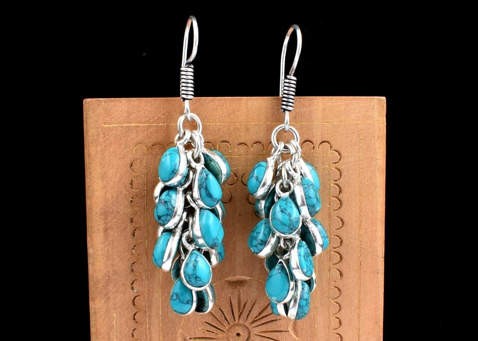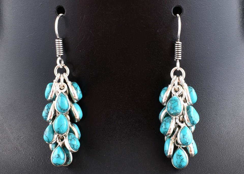 925 Sterling Silver Handmade Grapes Bunch Turquoise Gems Dangle Antique Earrings