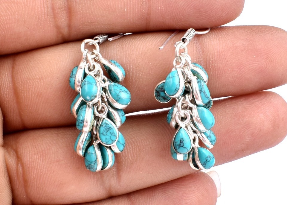 Handmade Turquois Gems Sterling Silver Grapes Bunch Dangle Earrings For Women