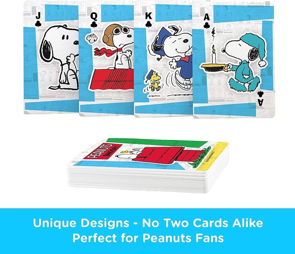 The product is a new sealed Aquarius Peanuts comic panel Snoopy dog theme playing card deck from 2020. This card deck features the popular Peanuts Gang character Snoopy and is part of the Comics Mangas theme. Perfect for fans of the Peanuts series, this deck offers a fun and nostalgic gaming experience with a charming Snoopy dog theme. Ideal for playing card games and poker with friends and family, this unique deck adds a touch of whimsy to your card game collection.