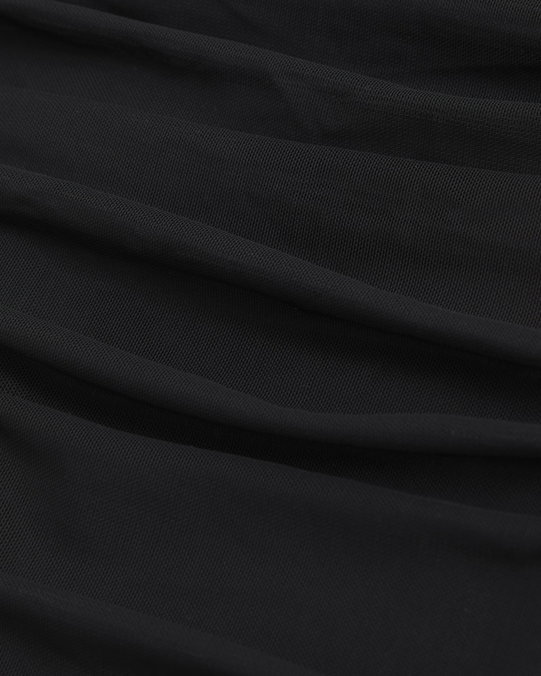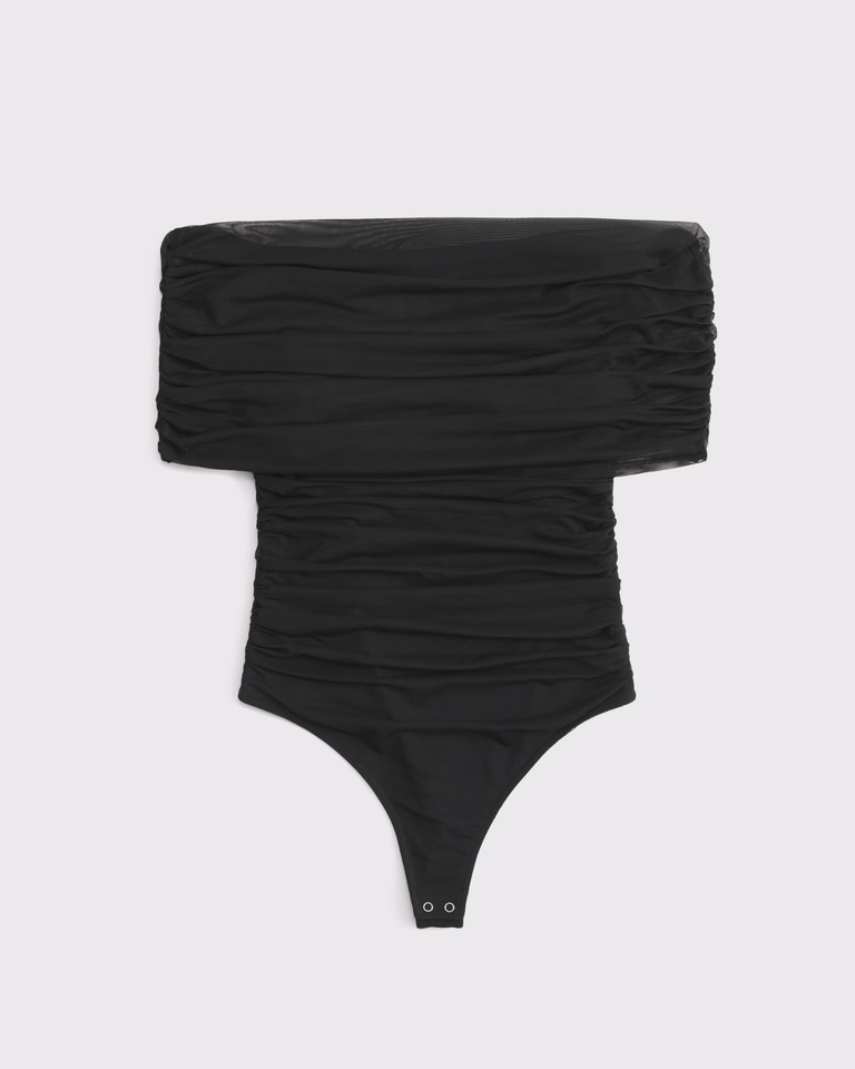 Slim-fitting bodysuit in soft mesh fabric, featuring an off-the-shoulder foldover neckline, ruching details along the bodice and two-snap bottom closure. Imported.