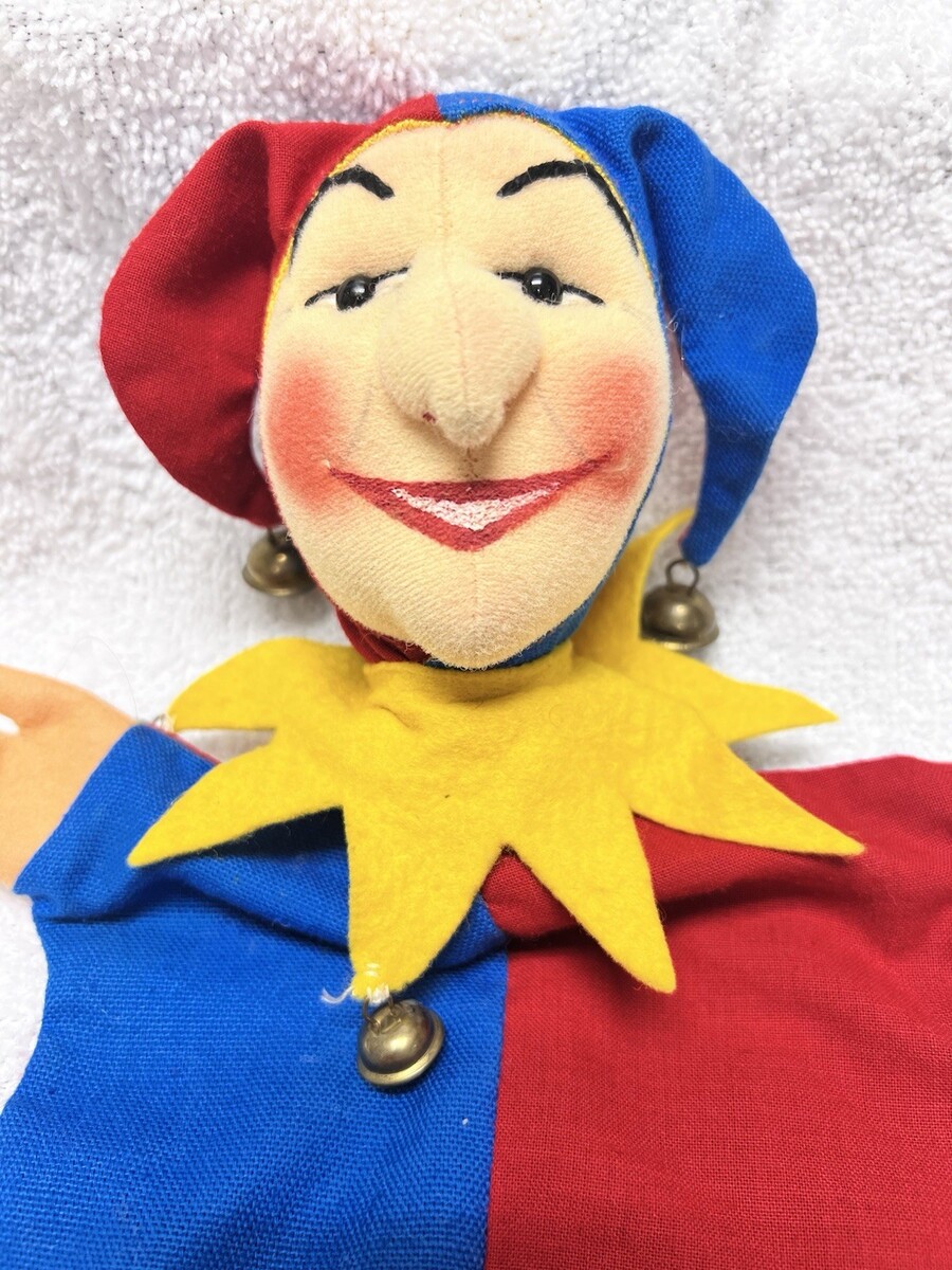 Vintage Court Jester Hand Puppet Sculpted Felt Face Hand Painted w Jingle Bells