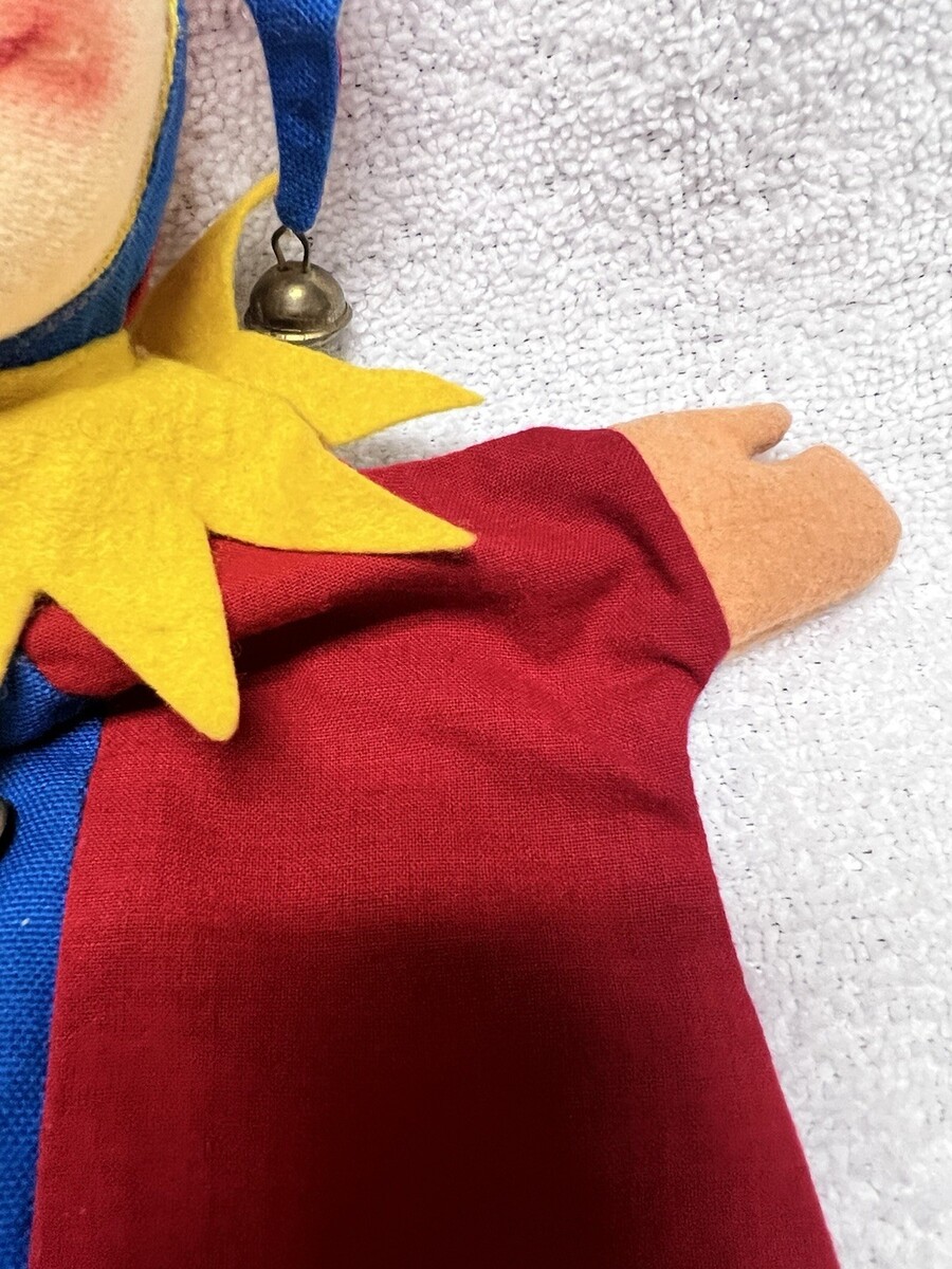 Vintage Court Jester Hand Puppet Sculpted Felt Face Hand Painted w Jingle Bells it has 2 safety pins we think holding the body to the head? in clean shape about 10.5 inches long