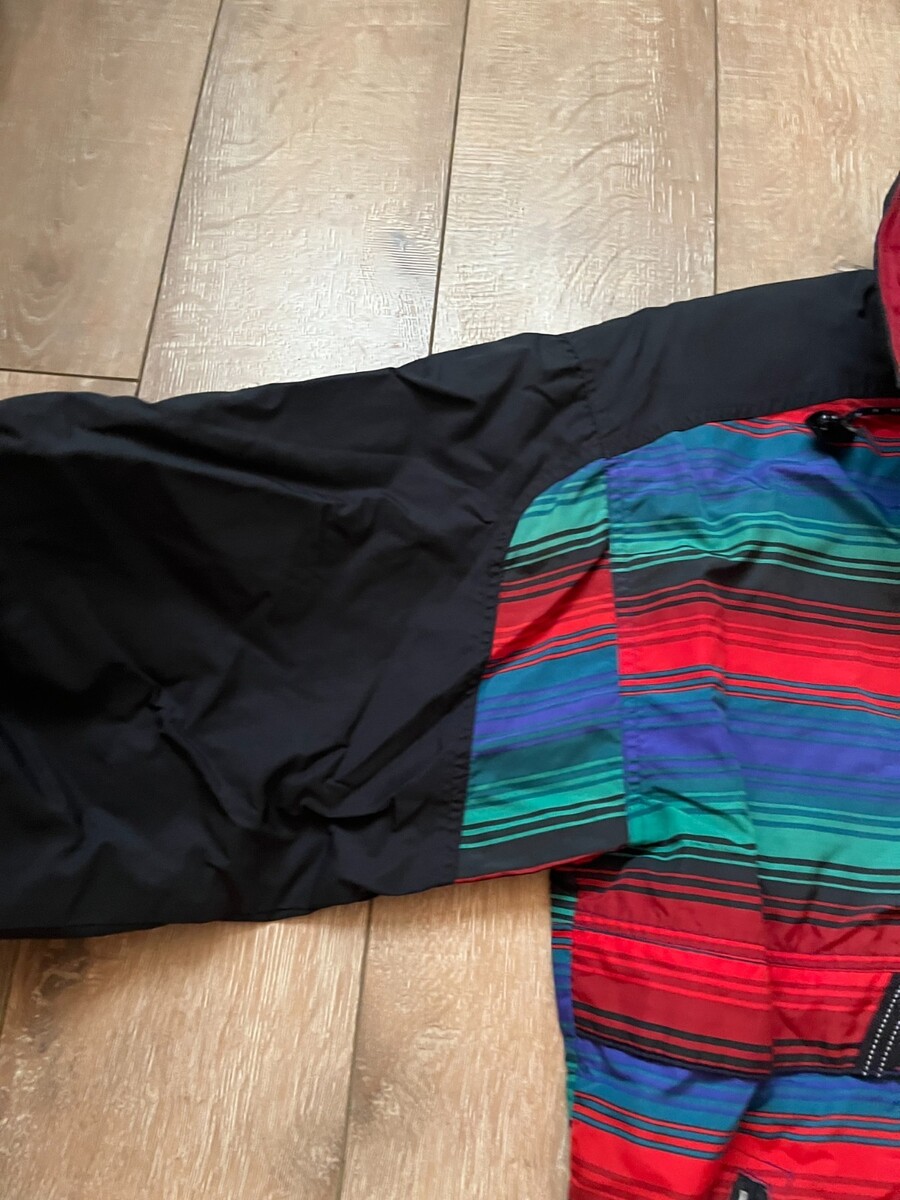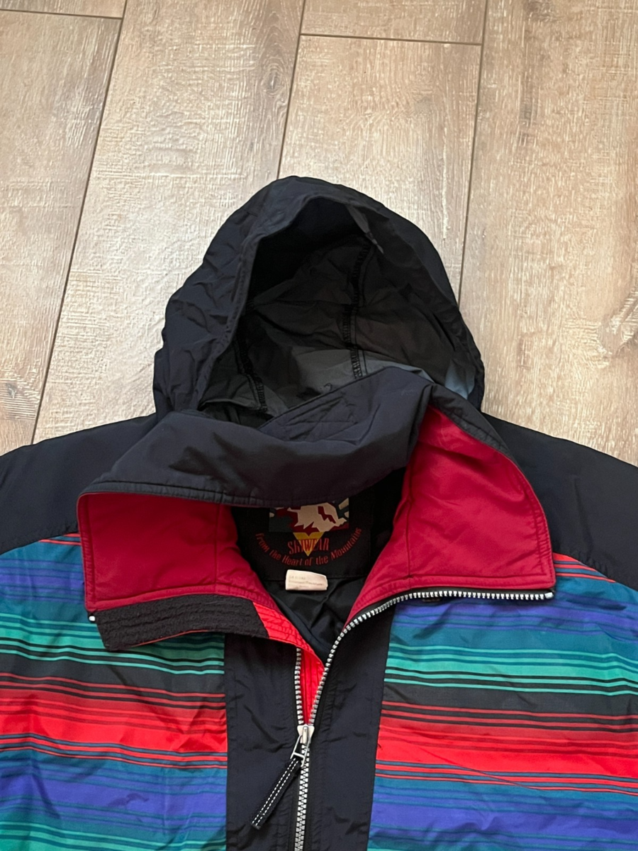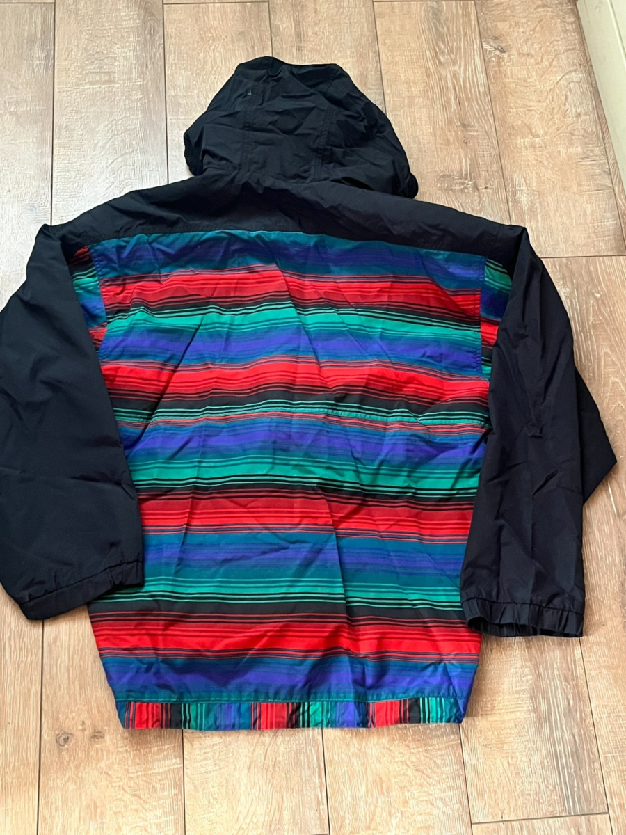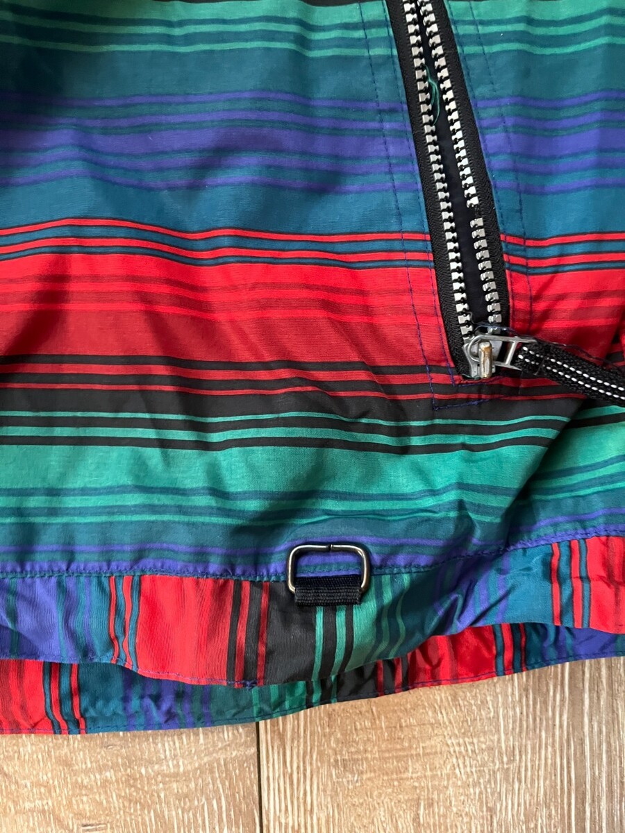 The Vintage Obermeyer Jacket is a men's half-zip pullover made of water-resistant and wind-resistant nylon material. This jacket features zipped pockets, a hood, and a soft shell fabric type, making it ideal for casual occasions in the fall and spring seasons. With a mid-length design and a solid multicolor pattern, this retro ski wear from Obermeyer has a classic style suitable for outdoor activities machine washable, this jacket offers a regular fit and is a unique addition to any wardrobe.