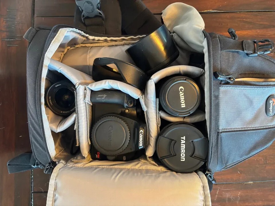 Capture stunning photos and explore your creativity with this Canon EOS Rebel XS Digital SLR Camera Bundle, complete with multiple lenses and a protective Lowepro carrying case. Perfect for beginners or enthusiasts wanting an affordable yet capable photography setup.This kit includes everything you need to get started right away ? from wide-angle to telephoto coverage, all packed neatly in a durable, travel-ready bag.? What?s Included:Canon EOS Rebel XS DSLR Camera BodyMegapixels: 10.1 MP APS-C CMOS SensorMount Type: Canon EF/EF-SCondition: Excellent ? minimal exterior wear, tested and fully functionalDisplay: 2.5? LCD screenAutofocus: 7-point AF systemMode Dial: Includes full manual (M, Av, Tv), automatic, and scene modesIncludes: Canon body cap and neck strapIncluded Lenses:Canon EF-S 18-55mm f/3.5-5.6 IS LensVersatile standard zoom lens for everyday shootingImage Stabilization for sharp handheld shotsClean glass, smooth zoom and focus ringsTamron AF 28-80mm f/3.5-5.6 LensGreat for portrait and mid-length shotsCompact and lightweight designSigma 70-300mm f/4-5.6 DG LensExcellent telephoto zoom for sports, wildlife, and distant scenesIntegrated macro switch for close-up photographyCanon EF 50mm f/1.8 Lens (visible in the camera bag photo)Renowned ?nifty fifty? prime lens perfect for portraits and low-light shotsCarrying Case:Brand: LoweproModel: Sling-style DSLR backpackFeatures: Well-padded with adjustable dividers for custom organizationCondition: Excellent ? clean and ready to use? Condition:All items are in used but excellent condition. Well, cared for and stored safely inside the Lowepro camera bag. Minor cosmetic wear consistent with light use, but everything functions perfectly. Camera and lenses have been tested ? autofocus and manual controls operate smoothly.*one lense is missing its cap!