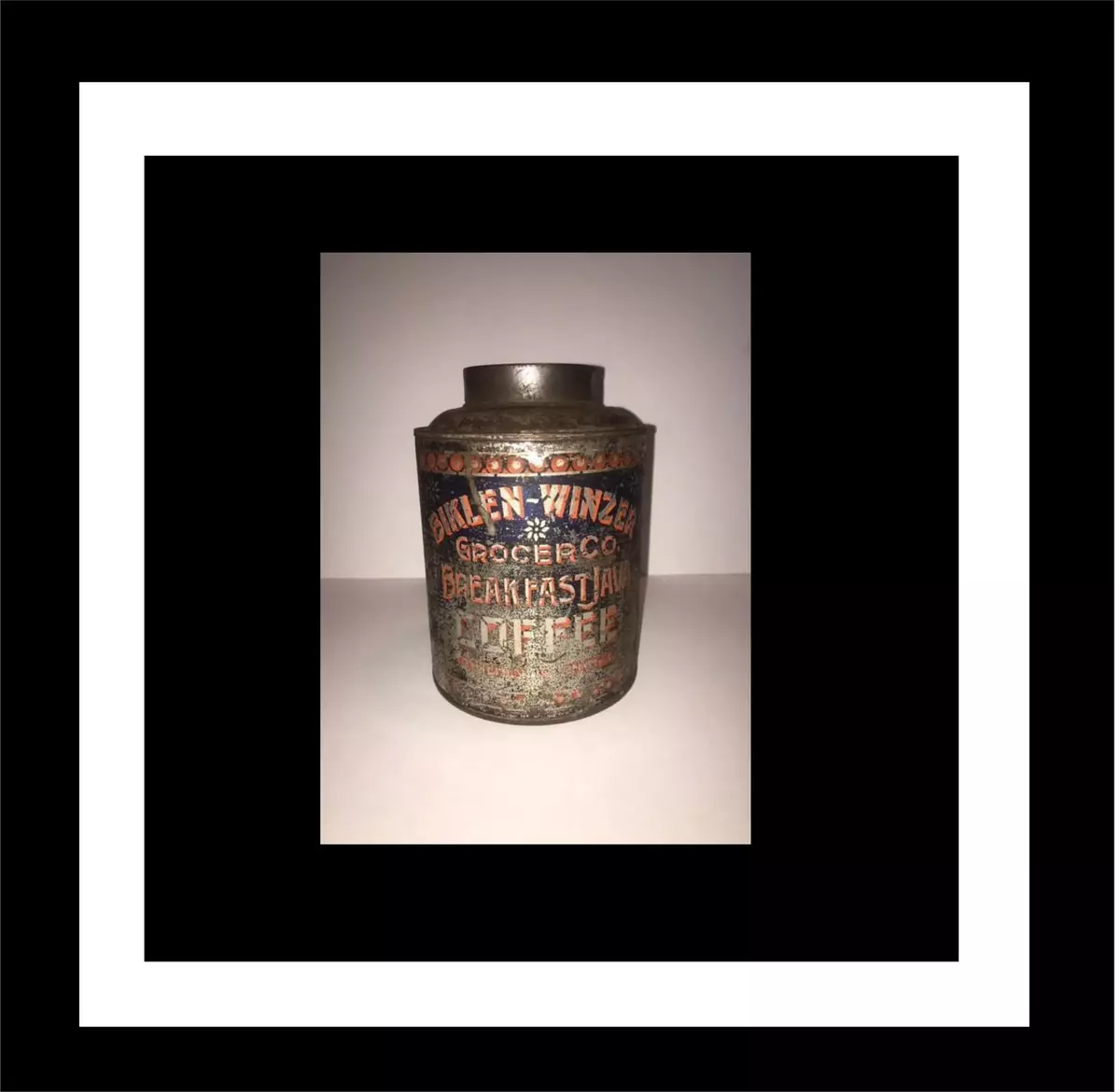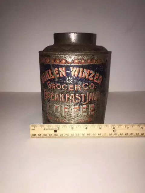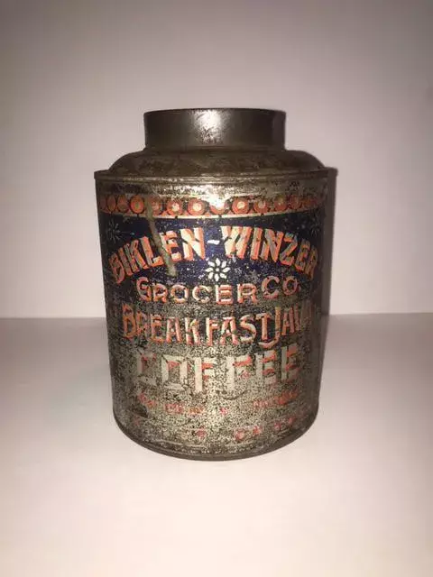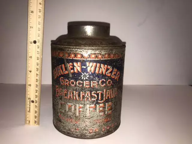 Here we're selling a Biklen Winzer Grocer CO Breakfast Java Coffee Tin from right around the 1910 to 1915 era. It's amazing, at least to us, to see common use items that have stood the test of time and are still here to be collected or used for decorating purposes.