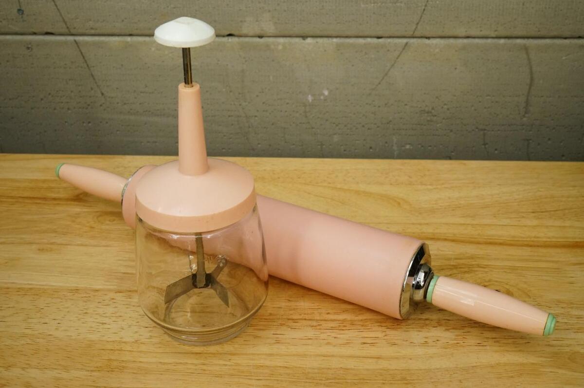 Vintage Pink Kitchen items. 2PC lot. 1) Federal Housewears Nut Chopper 8-5/8" tall 2) Ecko Melamine Rolling Pin pink with mint gree accents. 17.5" long. No smoke or pet odor. Both in working condition.