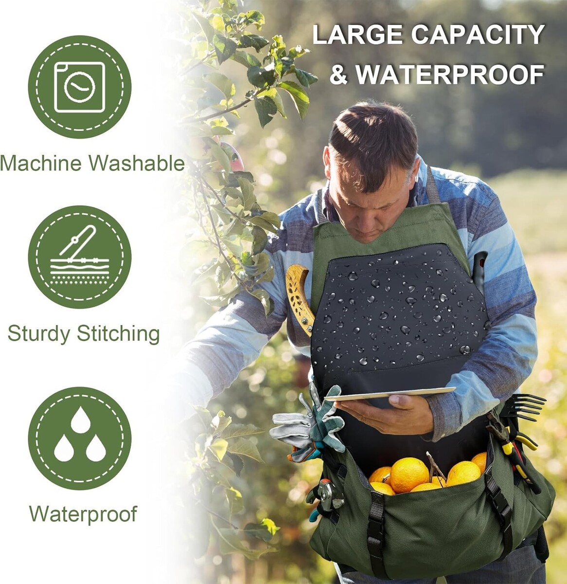 Sturdy and Durable: Crafted from high-quality 600D polyester with a waterproof, tear-resistant lining to withstand the rigors of gardening and protect against stains from weeds, veggies, or fruits.