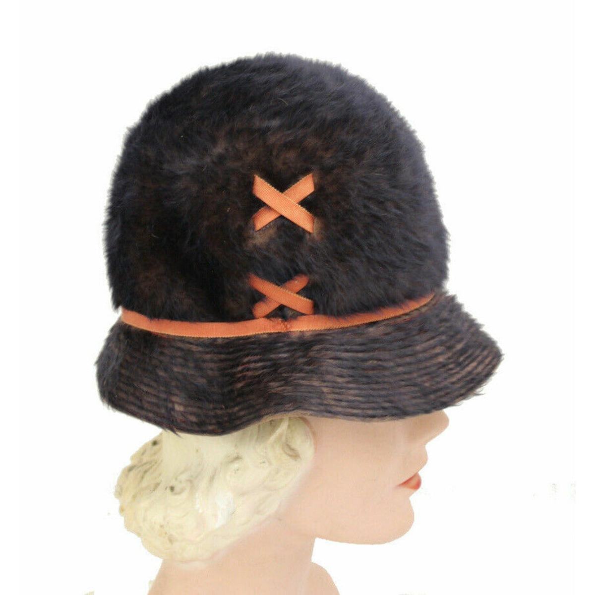 What you?ll love about this 1960s Miss Carnegie bucket hat is the plush brown Austrian wool body woven to mimic fur, trimmed with cinnamon grosgrain ribbon and delicate crisscross detailing at the crown. It?s Mod but restrained ? polished enough for Fifth Avenue, playful enough for Carnaby Street.
