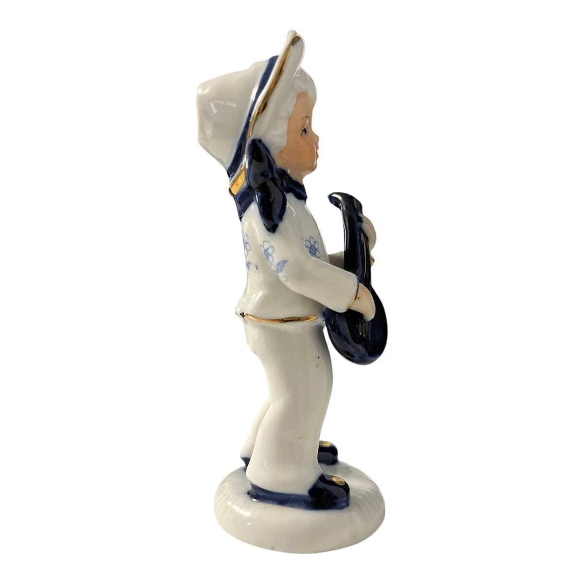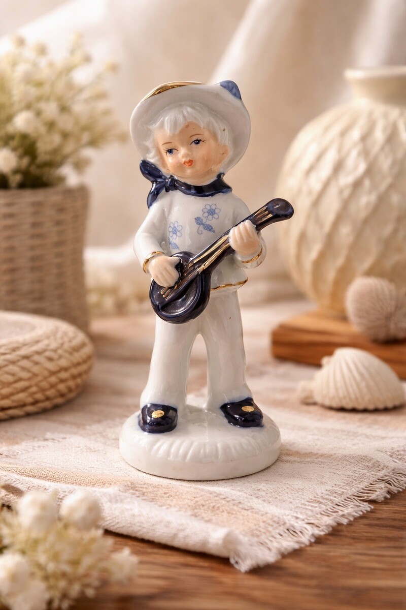 Vintage Enesco Porcelain Figurine Boy With Guitar 1980 Blue White Gold Trim