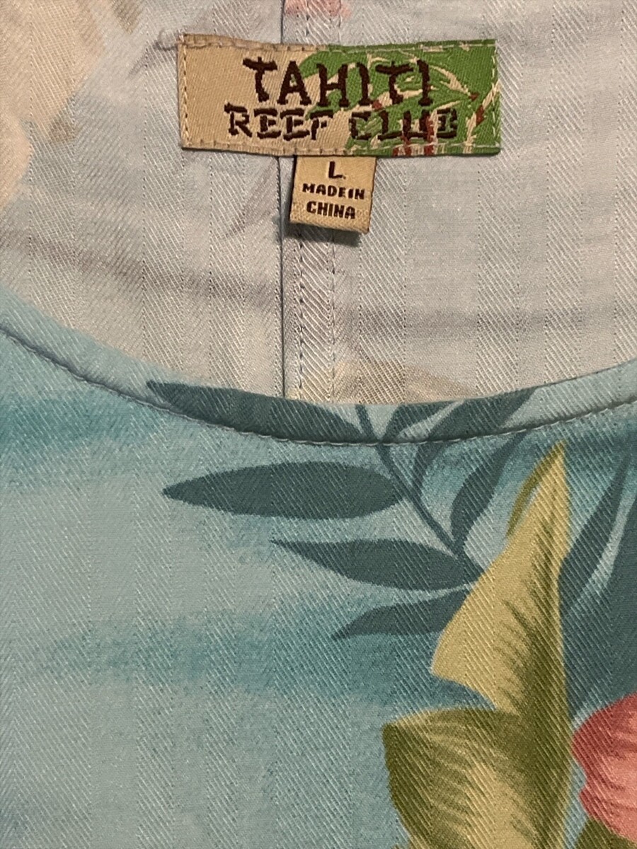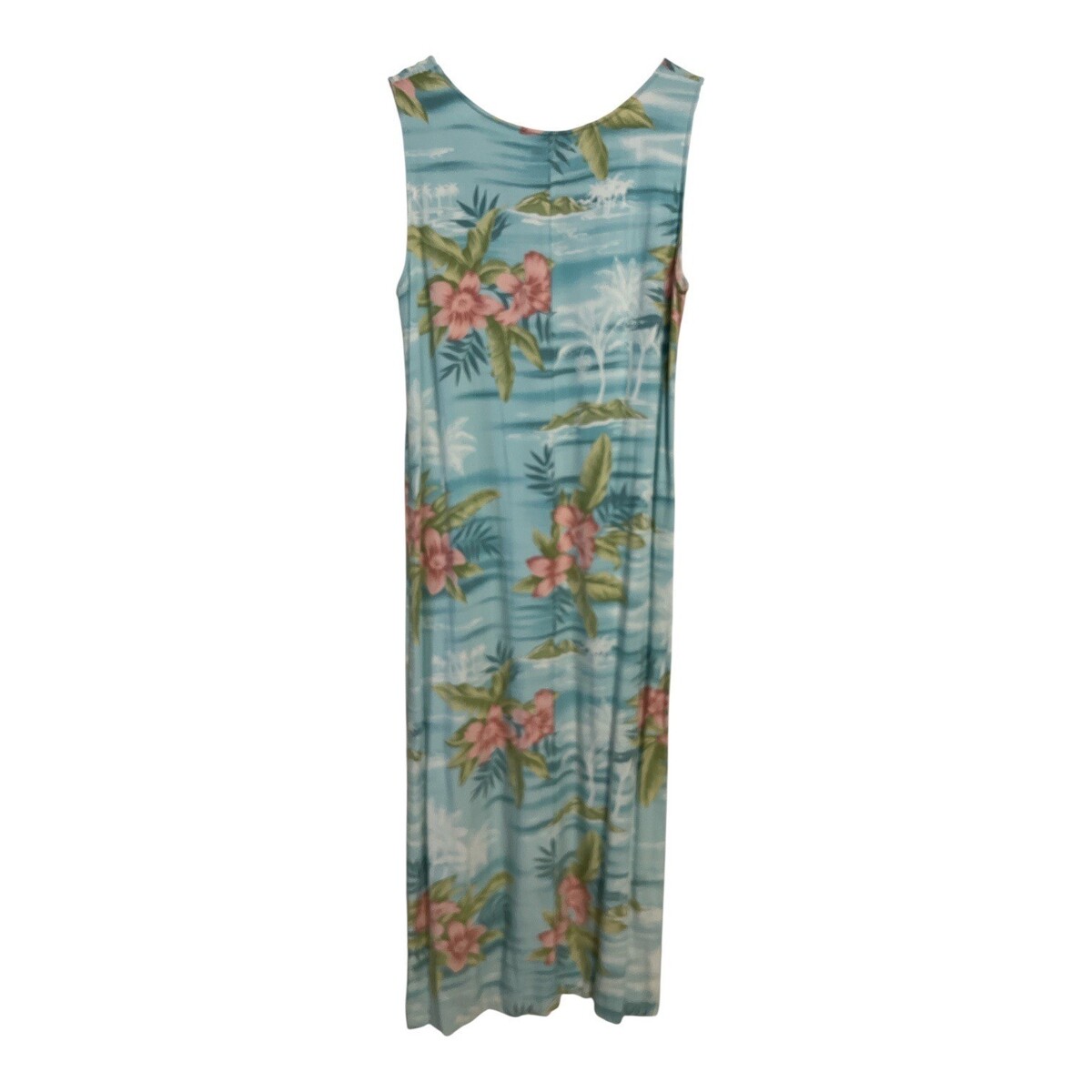 Vintage Tahiti Reef Club Hawaiian Maxi Dress Size L Blue Tropical Floral Rayon