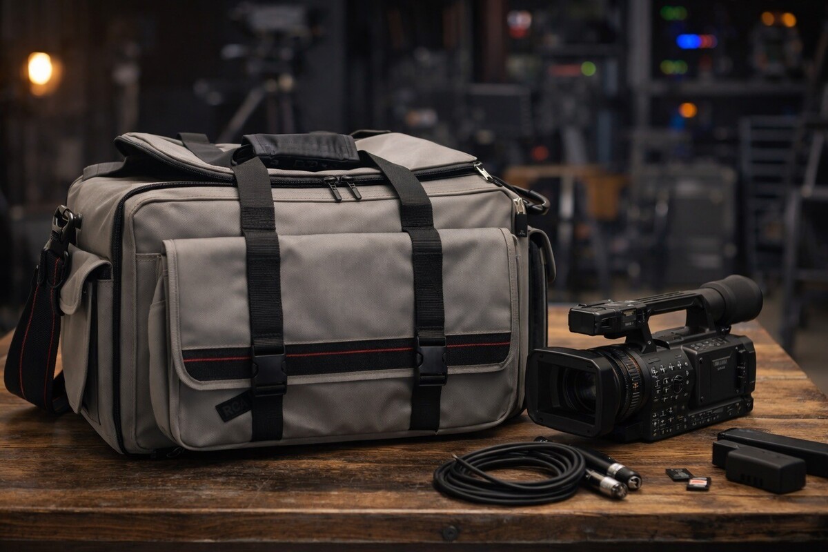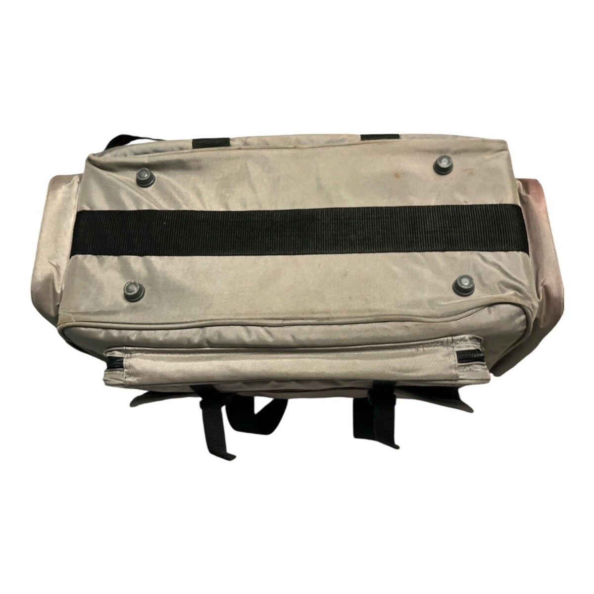 Original RCA equipment bag designed for transporting video cameras and accessories. Structured padded interior with divider sections protects gear while multiple exterior pockets keep cables, batteries, and lenses organized. Durable nylon construction with reinforced handles, adjustable shoulder strap, and protective bottom feet. Ideal for videographers, collectors, field recording, or camera storage.