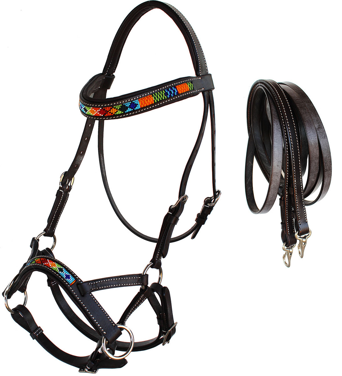 Challenger sidepull is hand crafted from top-quality full grain oiled black leather to ensure durability. Bridle comes accented with a multicolor beaded inlay, and white contrast stitching. Sidepulls are a perfect bitless training aid for horses that are not bit ready or for those who have sensitive or injured mouths. Fits most average to large horses. Other features include a padded crown, browband, and nose to ensure comfort, rust-free stainless steel hardware, and comes complete with matching tie bit end split reins.