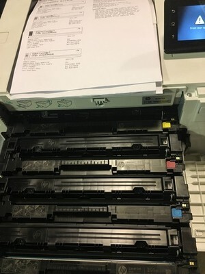 A set of 4 toners (CYMK) are nearly full, but not guaranteed after shipping