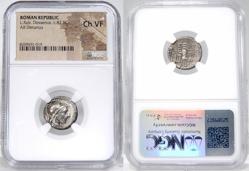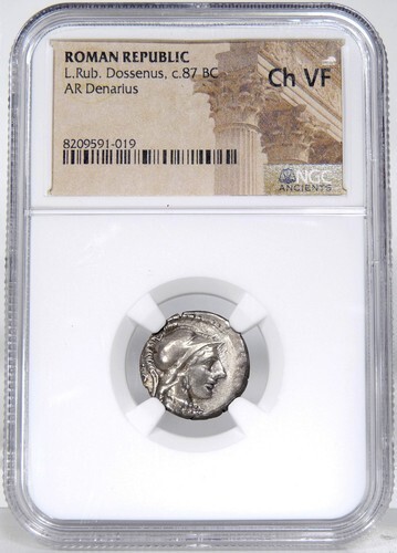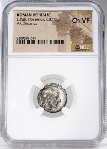 Obverse: Helmeted bust of Minerva right, wearing aegis; DOS behind~Unabridged legend: Dossenus .