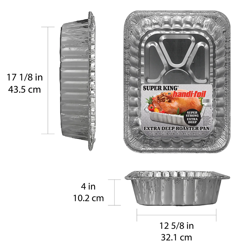 Upgrade your kitchen pantry with this Handi-foil Super King Aluminum Foil Roaster. It is made of aluminum for quick and even heating and great results every time. The pan dimensions are 17 1/8-inches long x 12 5/8-inches wide x 4-inches deep. The generous sized super strong and extra deep pan is ideal for large roasts, glazed ham, roasting chickens, turkeys and even vegetables. The deep side walls keep your food and juices in the pan where it belongs. Remember to support the bottom of the pan when it has food in it to prevent accidents. Use it for your next Sunday dinner, parties or for the holidays. Spend more time with your family and friends and less time in the kitchen scrubbing pans. This pan is disposable so you can take it to a party and not worry about getting your pan back. Kosher certified by the Orthodox Union.