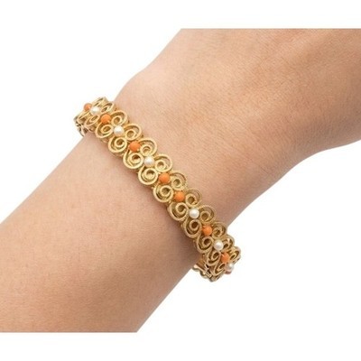 What you?ll love about this bracelet is the exquisite mid-century filigree craftsmanship?ornate gold-tone scrollwork punctuated with warm coral beads and luminous faux pearls. The design delivers unmistakable romantic, old-world elegance with a touch of bohemian glamour, evoking heirloom jewelry from a more glamorous era.