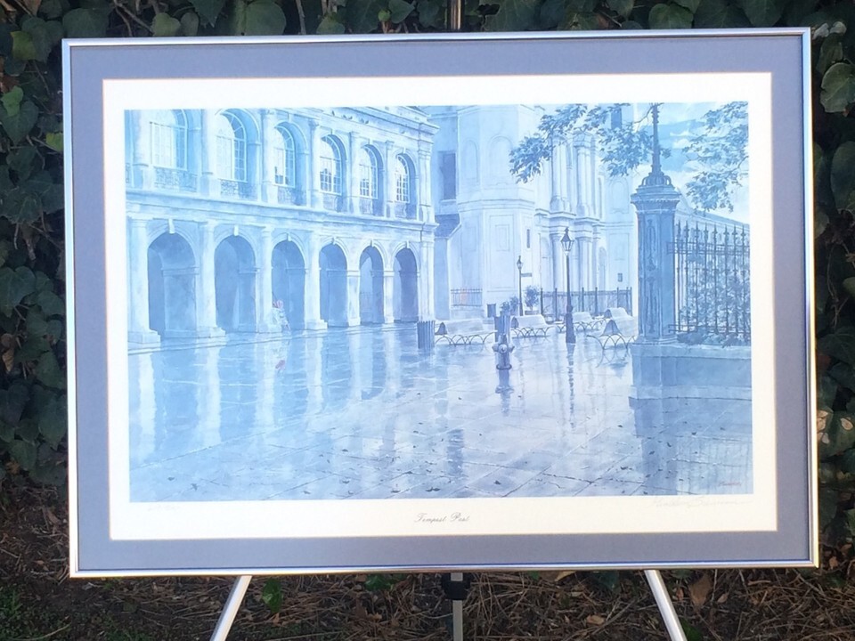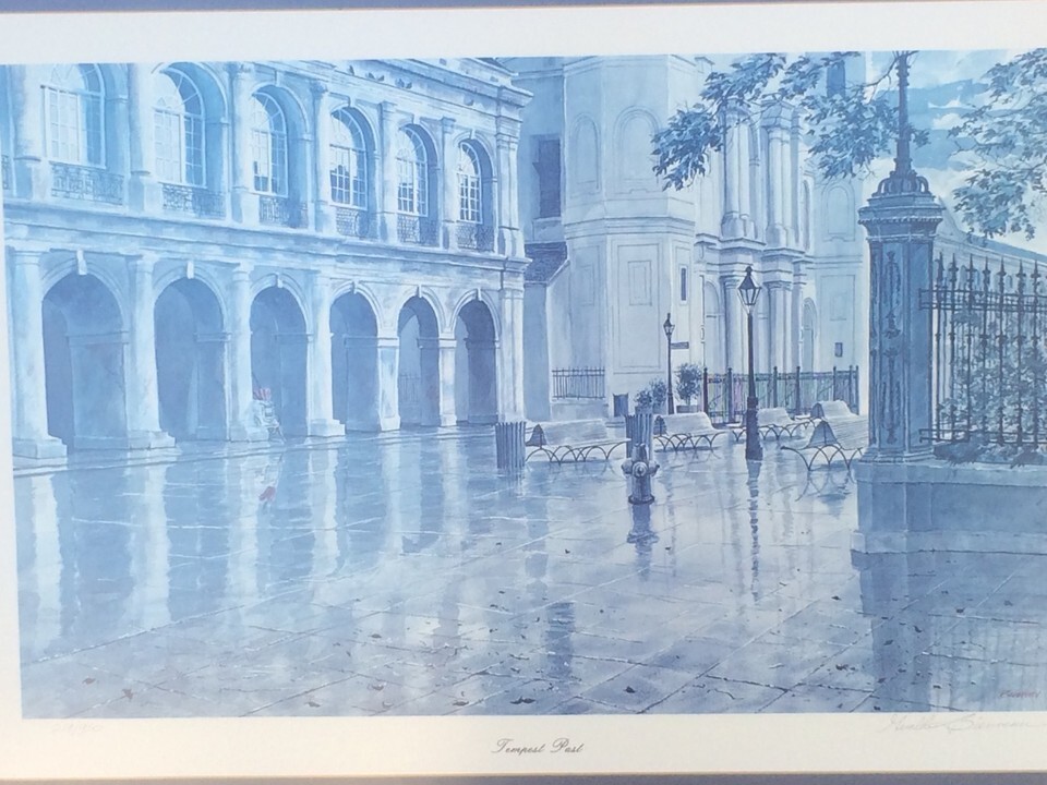 Limited Edition framed lithograph in a wood frame with glass: Tempest Past by Gerald Bienvenu. It is an artist's impression of the French Quarter of New Orleans.