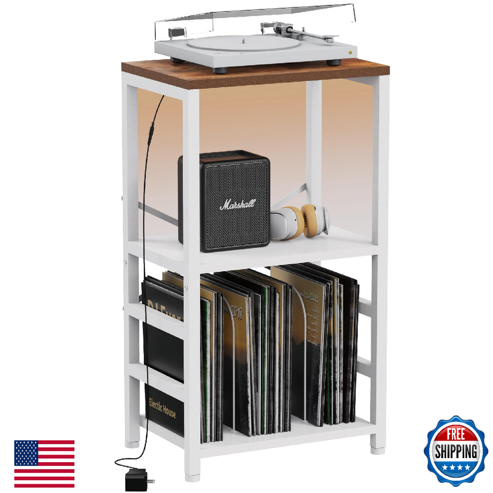 YAKANJ End Table W/ LED Light, Record Player Stand & Vinyl Storage