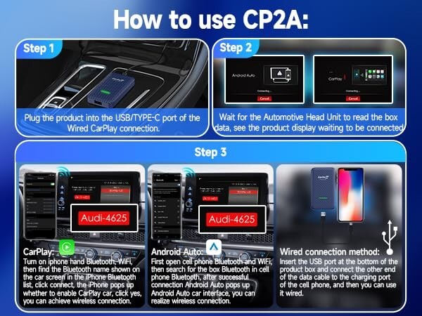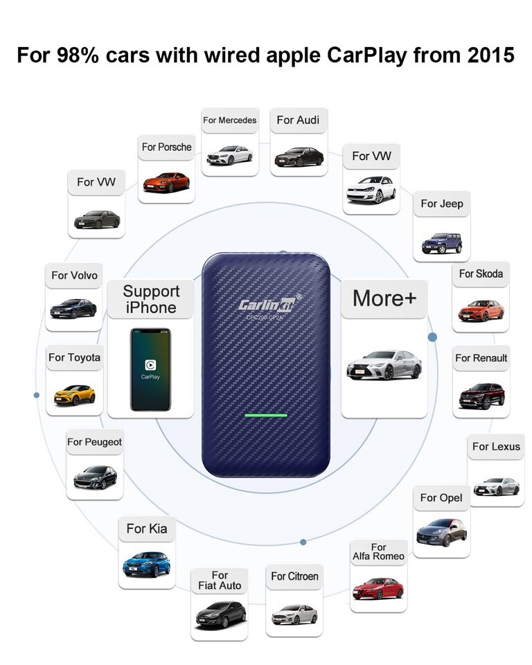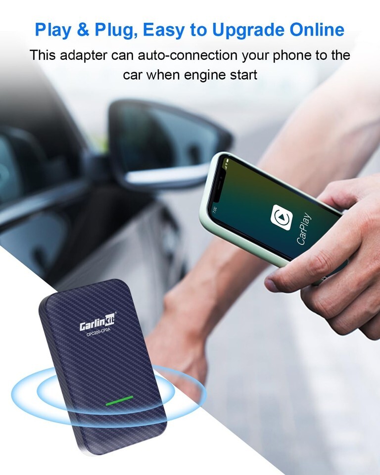 Cutting-edge Wireless Technology: Our CarlinKit 4.0 adapters redefine in-car connectivity with Two antennas and wireless Android Auto, offering a blazing speed of 866Mbps. Unlike competitors with slower speeds, our adapters support touchpad operations, ensuring a seamless experience for both Android and Apple devices without the need for switching or restarting.?Not compatible with car without factory CarPlay prep) ,CarlinkKit 4.0: Effortless Integration for Factory Wired Cars: CarlinkKit 4.0 boasts a USB plug play design, eliminating the need to dismantle your car. Once paired, it seamlessly reconnects on car restart, preserving original features like voice control and touchscreen. Compatible with over 98% of factory wired CarPlay cars, it includes both USB Type-A and Type-C cables for versatile use across different brands and sockets.,Wireless Magic for Android Auto and CarPlay: Experience the magic of CarlinkKit 4.0, transforming wired into wireless connectivity effortlessly. Perfect for online navigation and music playback during your car journeys, it caters to both Android and iPhone users (IOS11+/Android 13 compatible). Enjoy the freedom of a wireless experience while retaining the convenience of CarPlay and Android Auto.,High-Speed Connectivity and Safety: Benefit from the lightning-fast 5G Wi-Fi (2.4GHz/5.8GHz) connection, ensuring real-time navigation and music streaming, even with your phone in your pocket. CarlinkKit 4.0 provides a secure and stable driving environment, allowing you to focus on the road while enjoying the convenience of wireless technology.,After-Sales Excellence and Compatibility Warnings:CarlinKit prides itself on having the strongest after-sales support in the industry. With a 90-day return policy, 365-day hardware guarantee period, and lifetime software upgrades and technical services, customer satisfaction is our priority. Note that BMW series cars are currently not compatible, and caution is advised for Volvo/Dodge models, which are undergoing optimization. Stay informed for the latest updates.,Note:CarPlay to Android Auto may have some resolution problems, if you mind, please don't buy it
