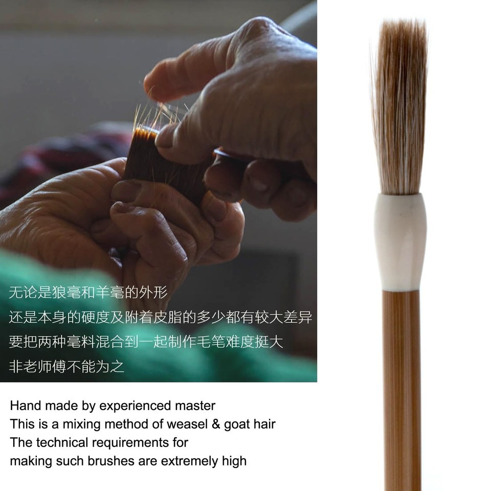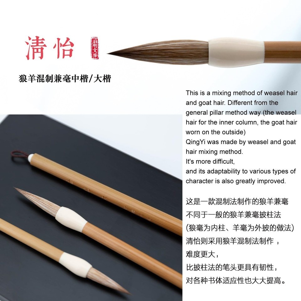 ?Hand-Made by Master?-- QingYi Chinese calligraphy brush was made by mixing-method of weasel goat hair. The technical requirements for making such brushes are extremely high. Hand made by experienced master and has undergone many times performance tests by Qi Ming Wen Fang to ensure brings to you a very good writing experience.,?Genuine Material?--This Chinese calligraphy brush was made by 45% weasel tail hair+45% goat hair+7% pig bristle+ 3% poly fiber, with strong water absorbing ability, strength and flexibility.,?For Script?-- Due to production method, the adaptability to various types of character is greatly improved. QingYi is suitable for Seal script / ZhuanShu, Clerical Script/LiShu, Regular Script /KaiShu, Cursive Hand / Caoshu, Running Hand / Xingshu.,?Anti-Cracking Shaft?-- With plastic parts on the shaft to prevent split off or tips falling off.,?QingYi Medium 1pc?-- Hair Length 3.8 cm, Hair Dia. 0.8 cm, for Font Size 5-8 cm.,????180 Days Refund????Floating hair falling off is normal on new handmade brushes, after a few uses, shedding should stop. However, if you use the brush more than ten times, every time there is a situation of hair loss, especially a large number of hair loss, it is likely to be the quality of the brush. ???You can E-mail us to return a refund. ???