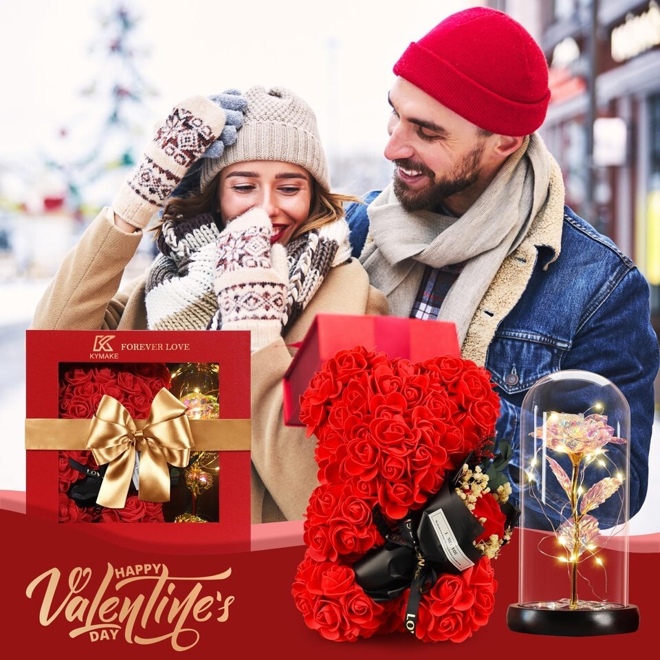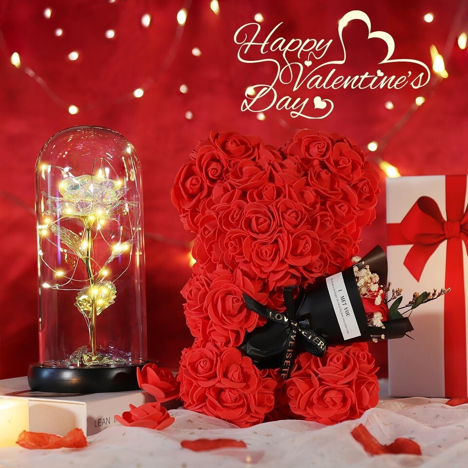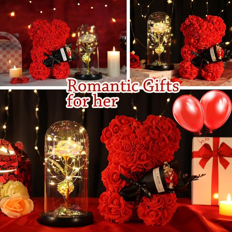 ?This is a perfect gift to make someone feel special?- Imagine the surprise of receiving this gift on her Birthday, Christmas, Mother's Day, Valentine's Day, Thanksgiving, Anniversary, Marriage Proposals, New Year's Day or other Holiday Occasions. Simple roses are already hard to impress a woman, and she can only be kept for a short time. The forever rose box and rose bear can accompany her forever.,?Everlasting love: Rose is a symbol of fine, best wishes, forever love, passionate and romantics. The glamour forever flowers gifts box will convey how much you cherish your loved one throughout the years. Give your wife, girlfriend. daughter, best friend, teacher and mother a simple, romantic gift. Each Rose Flower is an unique work of art that is a stunning symbol of long-lasting friendship, beauty, and love. Eternal rose is also the best blessing for the newlyweds.,?Suitable for Every Women: This gift set is perfect for a variety of people and occasions. It makes an ideal Mother's Day gift for mothers, but it is also perfect as a birthday gift for daughters or friends. It is the perfect holiday gift for women, making it a great choice for Christmas, Valentine's Day.,?Unique Idea Valentines Day Gifts for Women : A thoughtful and warm gift for your special someone,this combination of romantic with rose bouquets rose teddy bear and colorful rainbow light up rose is the perfect way to show your love and affection on Valentine's Day, Mothers Day, Anniversaries, Birthdays, and more ideal for wife, girlfriends, mothers, daughters, and all the special women in your life, this gift will leave a lasting impression and bring a smile to their face.,?Ideal Gift for Her: The rose bear is designed according to the shape of rose flower teddy bear, made of artificial roses, with lovely and romantic attributes, packaged in a transparent gift box, it will bring her a bright vision,Mother's Day, Anniversaries, Birthdays, and more, Ideal for wives, girlfriends, mothers, and all the special women in your life, this gift will leave a lasting impression.,?Safe Material: This gift set is made from high-quality materials, ensuring that it is safe and durable. It is hypoallergenic, making it perfect for anyone with sensitive skin. Excellent quality, safe material, whether it is given to children or the elderly can rest assured.