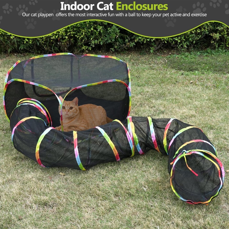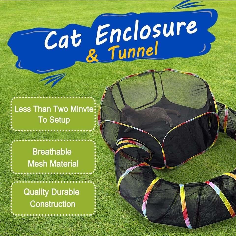 ?Outdoor Cat Enclosures?The pet playpen has one cat tent, one cat tunnel, one cat toy ball with Bell - The cat tent with two big zipper doors, The cat tunnel can link to cat tent by zipper for cats to play. Cat tent and cat tunnel can be used together or separately. Cat Enclosures surface is designed with a non-slip rubberized coating, prevents sliding. And it is safe for pets.,?Large Space, More Comfortable?The cat tent dimension after expansion W:47" x H:18" (W:120cm x H:45cm), providing ample space for your pets to play and exercise. While the tunnel dimensions measure 12*124 inches. With over 15 square feet of activity space, this outdoor Pet Mansion accommodates multiple cats, rabbits, guinea pigs, ferrets, and other small animals. Enjoy plenty of extra space for toys, treats.,?Mesh Design, Better Breathability, Easier Observation and Interaction?Cat playpen was using premium materials such as breathable mesh and oxford fabric. This ensures durability and comfort for your cats indoor and outdoors. The mesh design keeps your pets close to nature, not only providing a breath of fresh air and granting you easy visibility into their daily activities within the cat patio enclosure outdoor.,?Portable Easy to Assemble?Come with simple but detailed instructions in storage bag, just follow the folding instructions, took about 2 mins you will put it away. The cat playpen is easy to assemble and disassemble, and can be folded into a compact size for easy carrying and storage. The included carrying bag makes it convenient to take the playpen to the park, beach, or other outdoor places.,?Safe Secure?The cat outdoor enclosure has a stable structure and strong joints, which can effectively prevent pets from escaping. The bottom of the playpen is equipped with four plastic tent stakes , which can keep your cat tent from being blown away when placed outdoors.,?Comfortable and Secure Shelter? Our Hexagonal Cat Tent can be used alone, it can offers a cozy sanctuary for your cat to relax and play. ensuring your pet is always entertained, whether at home or on the go !,?Multiple Uses?The outdoor pet enclosure is not only suitable for cats, but also for small dogs, rabbits, ferrets, and other small animals. It can be used as a cat playpen, dog playpen, pet training pen, or outdoor playground....