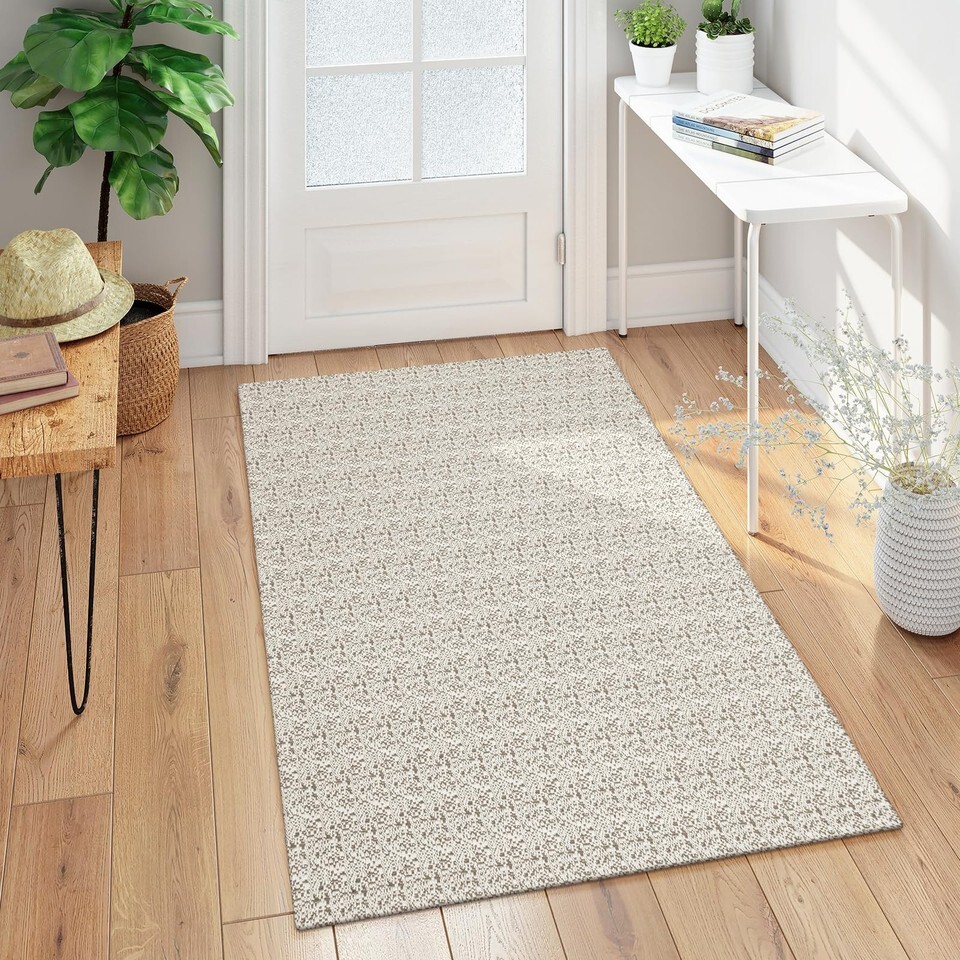 Machine Washable: With a flat-weave design, farmhouse bathroom rugs runner is dust and stain resistant, making maintenance a breeze. Simply machine wash or vacuum to keep your space fresh and clean. No bleach required, tumble dry low or air dry,Braided Texture: Made of polyester and cotton fibers, the bedroom carpet is very soft, and the hand-woven texture makes the carpet more sturdy. Due to hand-woven, there may be an error of 3-5cm and the edges are not very straight,Low Profile: At a thickness of only 0.18 inches, washable rug low-pile design is won't block doorways, minimizing tripping risks. The entryway rug adds a natural and warm atmosphere to the busy entrance, helping you welcome guests with ease,Non Slip Rubber Backing: The carpet runners has woven textured surface and anti-slip rubber dot backing, provides excellent traction on wood or tile floors, preventing slipping in high-traffic areas and keeping your family safe,Multi-Purpose: Hallway runner rug in a neutral tone that complements any decor. Choose carpets of the appropriate size based on the different sizes of Spaces such as the entrance, kitchen, bathroom and bedroom,Note: Our carpets are folded into small packages. When you get them for the first time, you will notice some creases or uneven edges. You can spread out the carpet in the opposite direction of the creases and iron the creases and edges with an iron