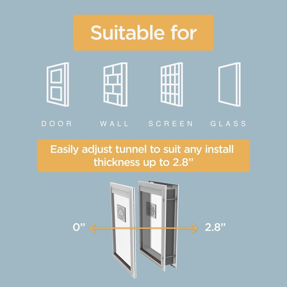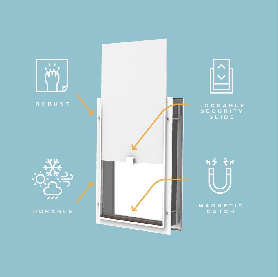 Improving the lives of pets and their people. Stop feeling guilty about leaving your pet at home and give them the freedom to come and go as they please. The Medium Deluxe Aluminum Pet Door with adjustable tunnel can be used for medium dogs up to 42 lbs. The outer frame measures 15.75" x 11.61" and the flexible flap measures 12.6" x 8.66", with a robust vinyl flap suitable for even the most energetic dogs. This pet door is uniquely designed for doors, screens, and walls up to 2.8" thick to allow your four-legged friend the freedom he or she needs for happiness and health. The two way controlled access allows your pet open access, with magnetic centering flap to ensure the door shuts after each use, keeping out drafts and weather. You can also change the access to locked, with the locking panel keeping your pet inside or out. Have complete peace of mind knowing that the Deluxe Aluminum Pet Door is designed to last and includes an industry leading 3 year limited warranty. Hakuna Pets is a dedicated pet care company, specializing in independence and safety technology to improve the lives of pets and their people. To create better lives, it is our mission to make the best in pet care available and affordable to homes and families around the world with a range of door types and sizes to suit all breeds and needs.
