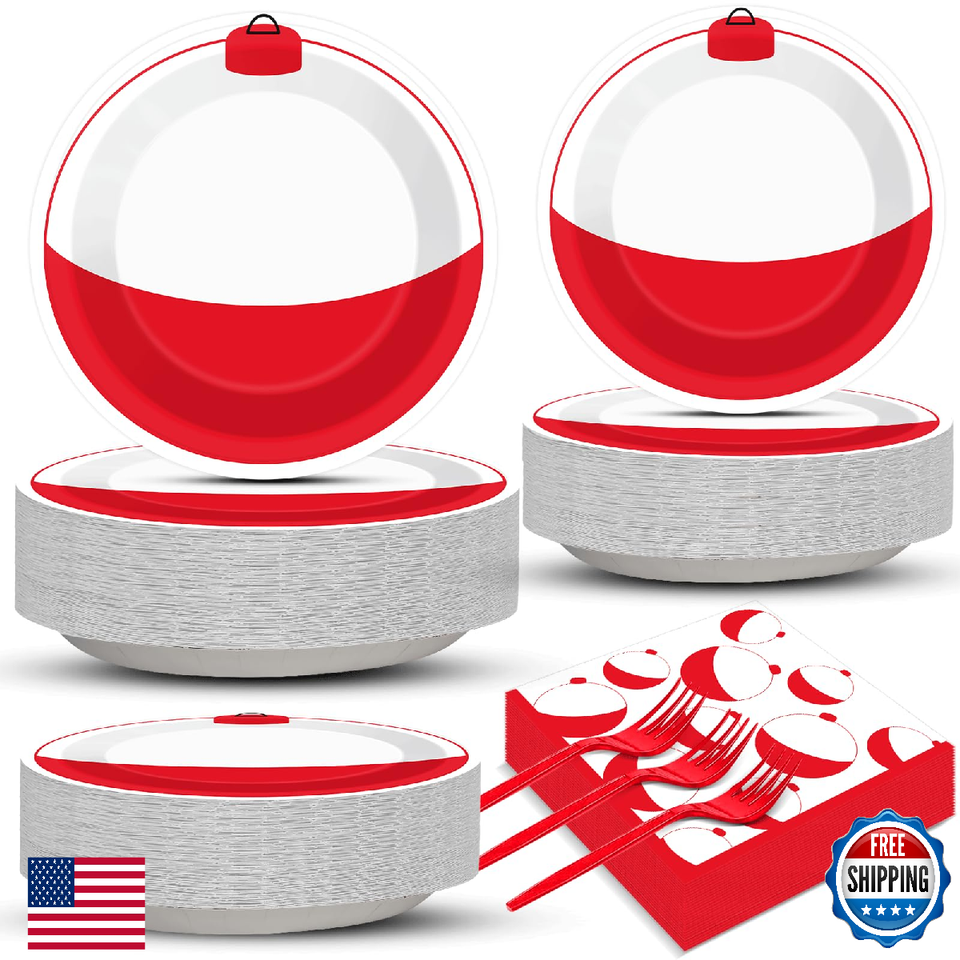 Package Includes: You will receive 50 pcs 9inch gone fishing party plates, 50 pcs 7inch fishing paper plates, 50 pcs 6.5inch fishing party napkins and 50 pcs red forks, enough to serve 50 guests.,Gone fishing party table decor: These gone fishing plates and napkins party decorations decorated with bright colors and delicate patterns, which are the great addition to your fishing theme party decorations.,Premium material: Our fishing bobber plates tableware set is made of quality paper, no smell and well-printed, the fishing party paper plates are sturdy while gone fishing napkins are soft and absorbent.,Convenient: The gone fishing birthday party decorations are the great addition to your fishing theme birthday party decorations. These gone fishing paper plates and napkins are disposable after use, saving your clean-up time.,Excellent match: Our pretty fishing bobber dessert plates can be matched with your other fishing birthday party decorations like fishing birthday party tablecloths, party banners and party backgrounds.