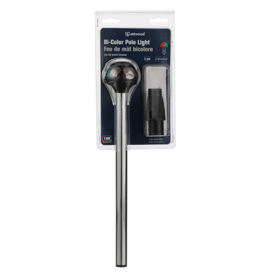 Bi-color stowaway bow navigation light 5092-10-7 features both red and green lenses that illuminate in a 225 degree arc. The aluminum pole has the universal locking collar for secure mounting to cam lock or threaded bases at the bow of your boat. The 9-watt, wedge base light is for use on boats to 12 meters/39.4 feet and has a low amperage draw to last a long time. The pole is easily installed for use or removed for storage during the day or in the off season. Attwood Corporation has been an award-winning leader in engineering, testing, and manufacturing the highest quality marine products for over 100 years. We deliver safe and reliable lighting, fuel systems, water systems, seating pedestals, swim ladders, custom upholstery, and general marine accessories that are easy to install and meet regulatory compliance.
