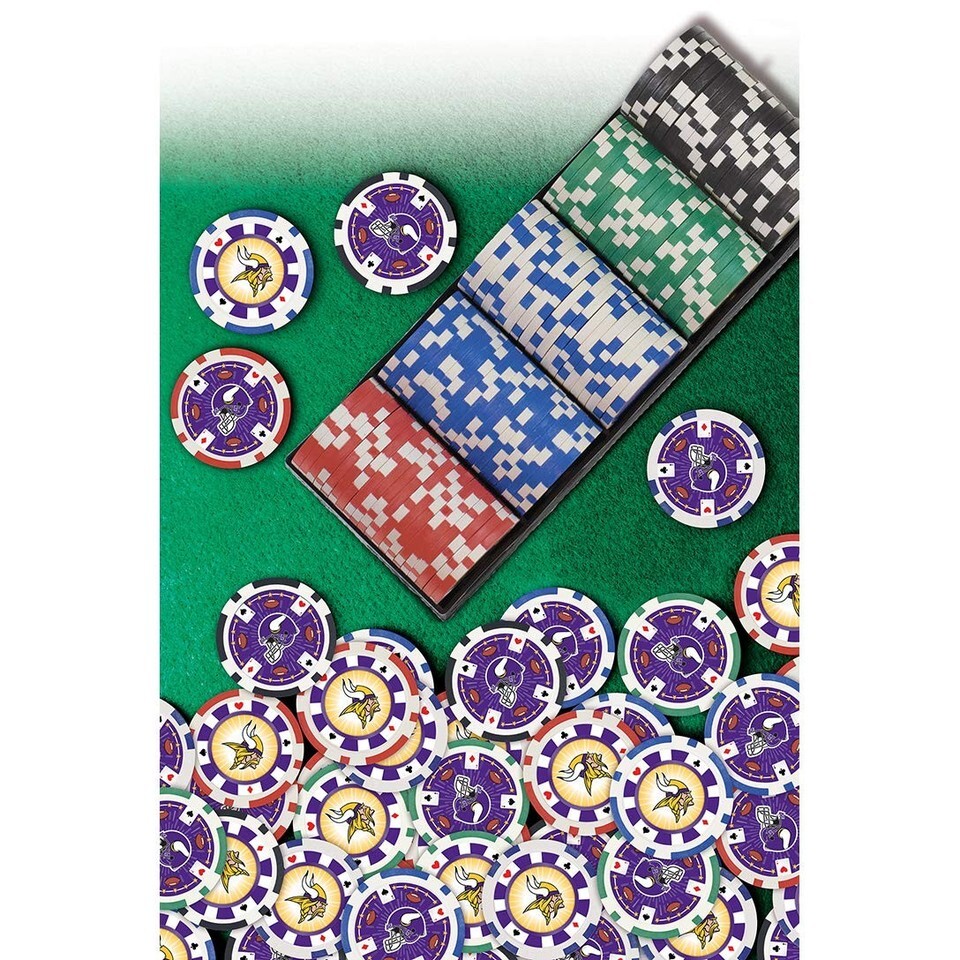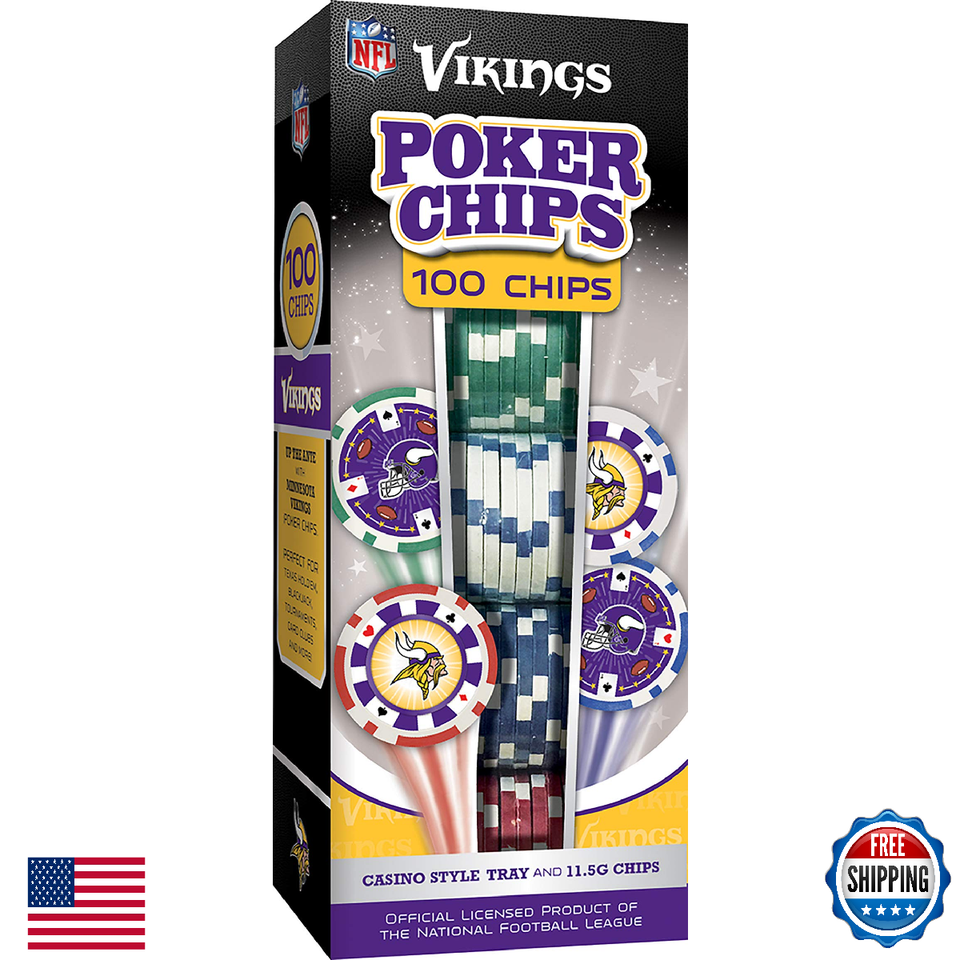 100 Casino Style Minnesota Vikings Poker Chips and Tray,Officially Licensed NFL Product; MasterPieces - An American Puzzle Game Company; We stand behind our products and your satisfaction,Standard-Colored Poker Chips Featuring Team Designs,High Quality, Heavy Weight 11. 5-Gram Chips,Black Tray Holds 5 Rows of 20 Chips for Easy Storage