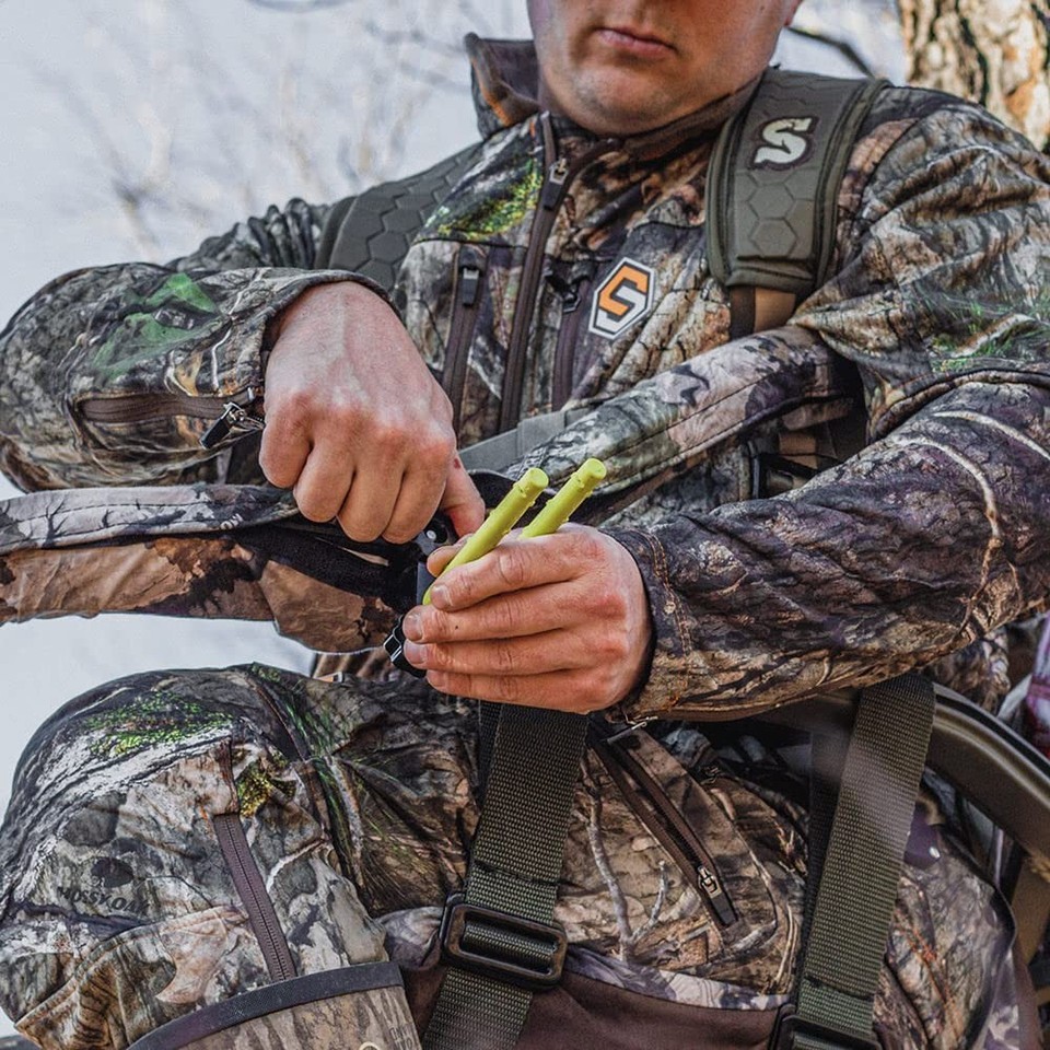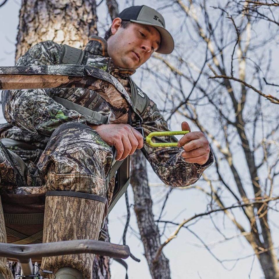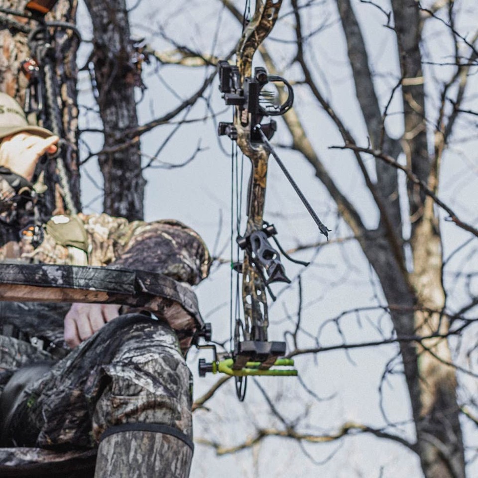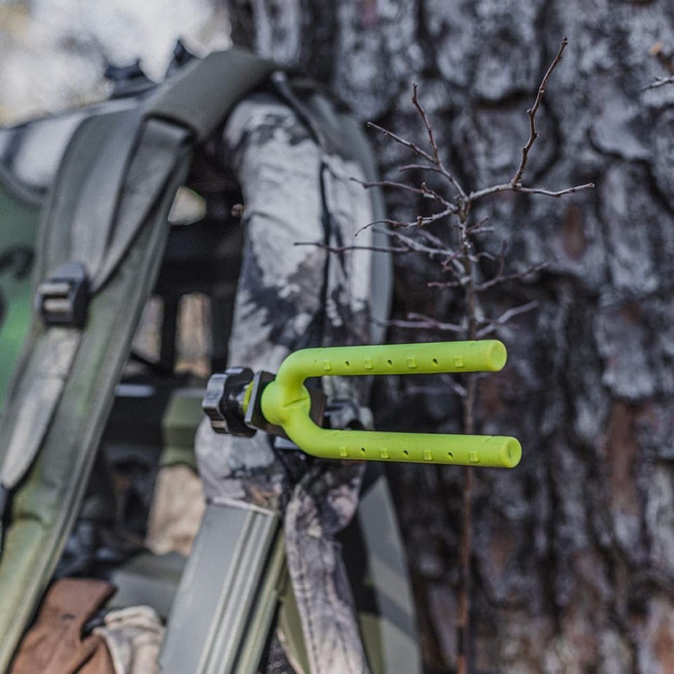 A new addition to the FasTrack accessory lineup, the FasTrack Bow Holder keeps your bow close and secure so you have quick access whenever the opportunity for the perfect shot arises. To lock in the Bow Holder, slide it into the FasTrack rail via one of the four entry ports on the front or sides of your seat frame. Once aligned in the desired spot, tighten the top knob. To adjust the angle of the Bow Holder, loosen the bottom knob, slide the green fork away from the metal bracket, rotate it to the desired angle, then slide it back into the bracket and tighten the bottom knob. Test and adjust the angle of the fork more as needed until it holds your bow without additional support