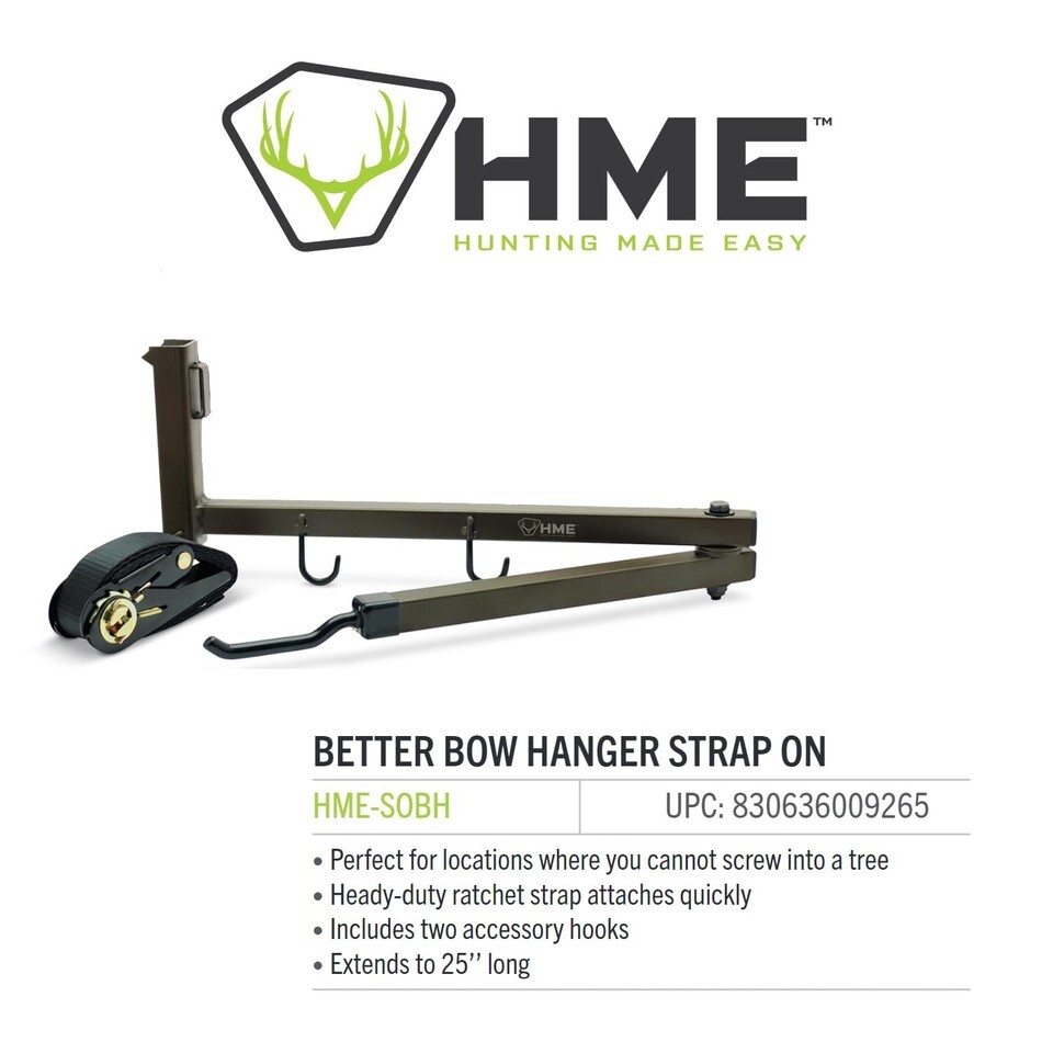 - Extends to 25"" long. The HME Better Bow Hanger Strap On is an essential accessory for bow hunters seeking a