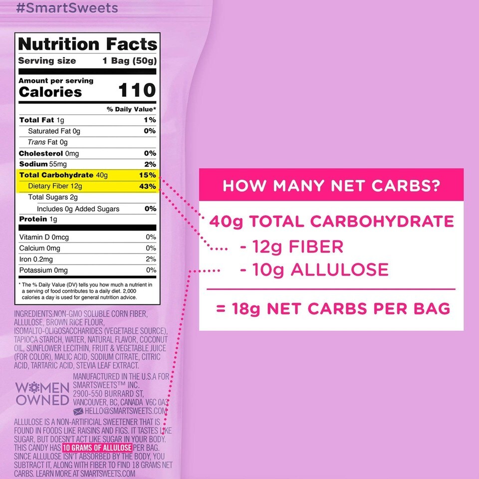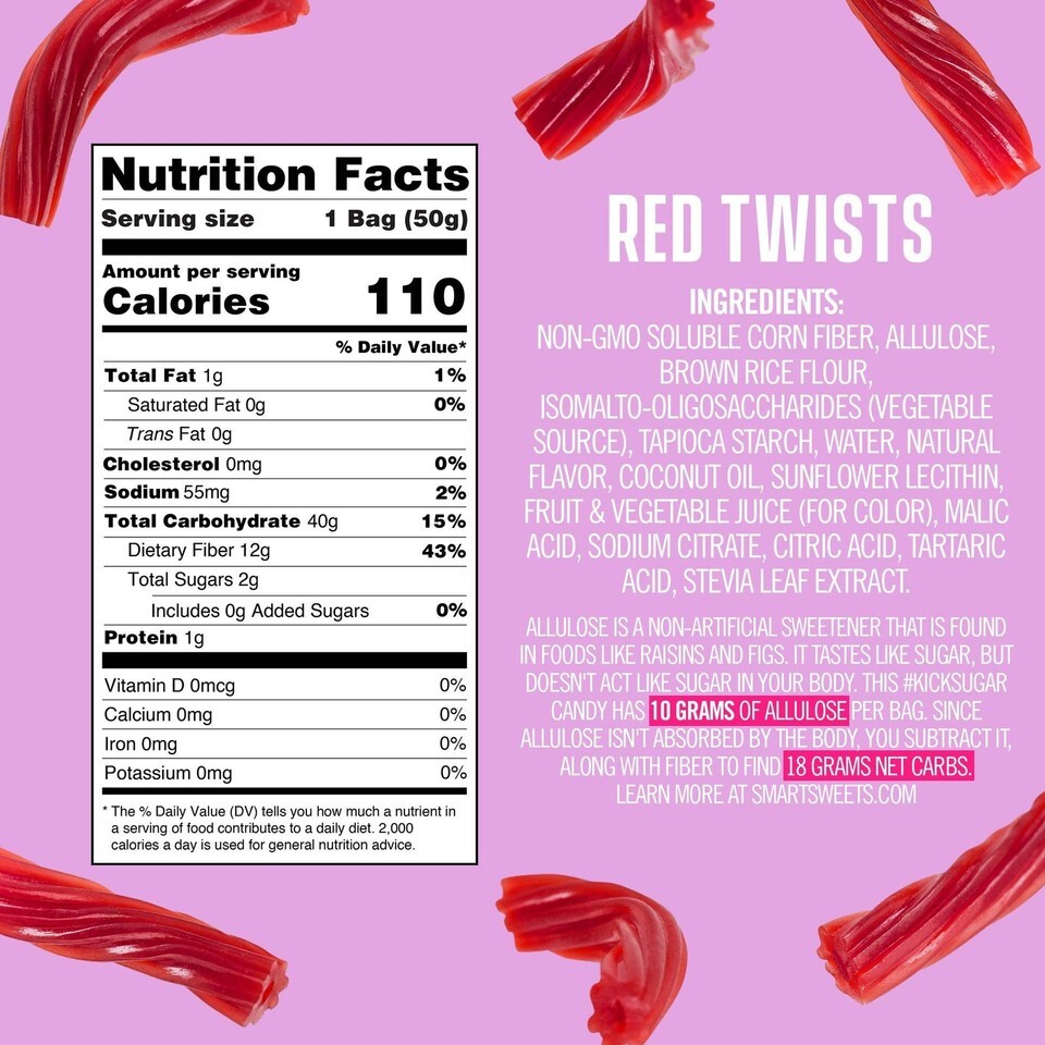 SMART SWEETS RED TWISTS 4 PACK HEALTHIER VERSION OF TWIZLERS 92% less sugar 12 grams of fiber Plant Based Vegan Keto Friendly ONLY 110 calories and 2 g Sugar