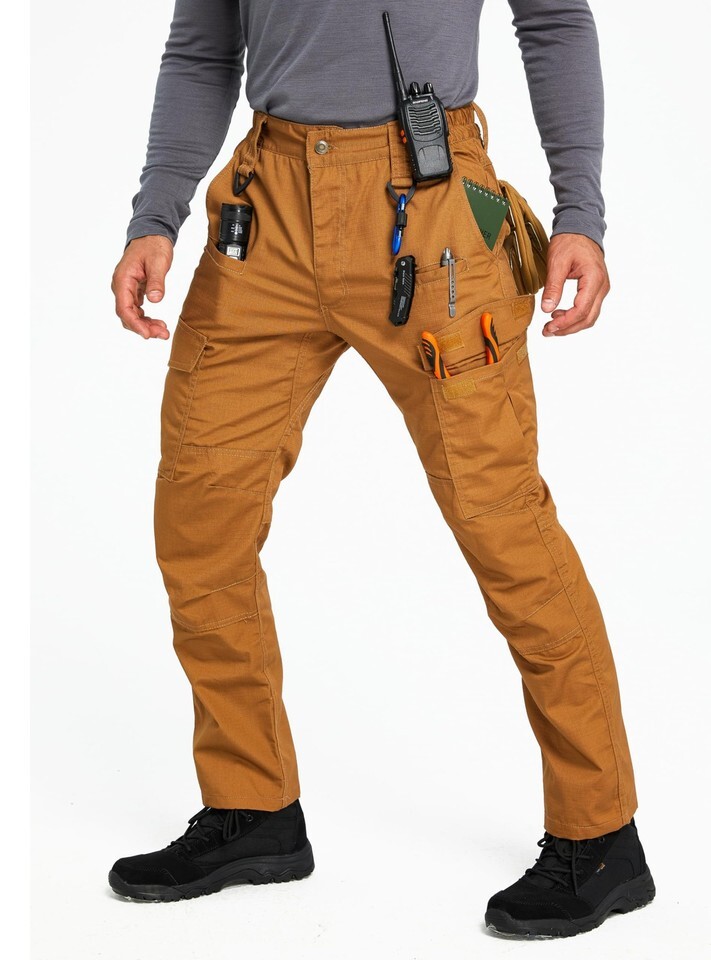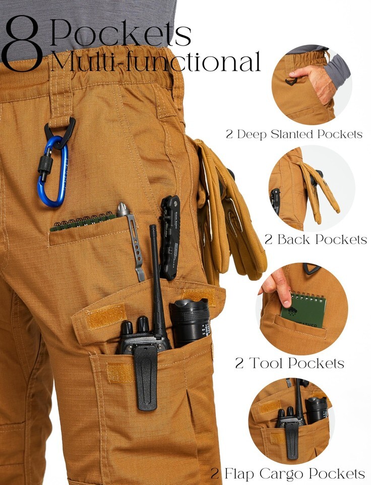 When choosing men's work pants, prioritize comfort, flexibility, durability and the convenience that multiple pockets bring to the job.,Durability: Men's work pants are made of polyester cotton blended ripstop fabric. Critical seams and stress points are triple-stitched for maximum strength and to prevent blowouts from heavy use and carrying tools. work pants are known for their reinforced stitching and durable construction to withstand tough jobsite conditions,Comfortable: Lightweight, breathable, quick-drying material provides all-day comfort. Adjustable waistbands design to provide a customized and comfortable fit. Mens work tactical pants elastic waistbands for added comfort and flexibility, widen belt loops to accommodate heavy-duty belts.,Flexibility: Flexibility: Articulated knees and gusseted crotches allow for unrestricted movement provide improved mobility for active jobs. Work pants have a relaxed fit through the seat and thigh to accommodate movement. This fit style combined with articulated knees allows FOR a full range of motion.,Multi-Pocket: Men's cargo pants are designed with 8 multifunctional pockets,include 2 deep front pockets, 2 back pockets, 2 large expandable cargo pockets, 2 small front pocket, These pockets provide ample storage space for carrying gear, tools, and other items.