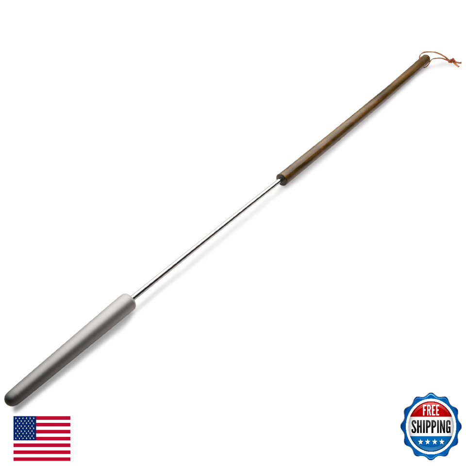 Make hot doughy treats over a campfire using store bought refrigerated dough (the pop open tube style). Just roll a "snake" of dough onto the breadstick in a corkscrew fashion. Hold over a fire turning slowly until the dough is golden brown on the outside and puffy on the inside. Slide dough off the stick and fill the cavity with jam, honey, butter, cheese etc... 38" overall length. Chrome plated steel rod, aluminum cooking stick and 21" extra long wood handle with leather hanging strap.