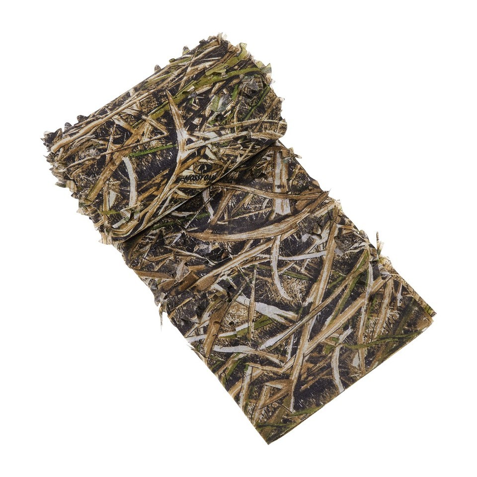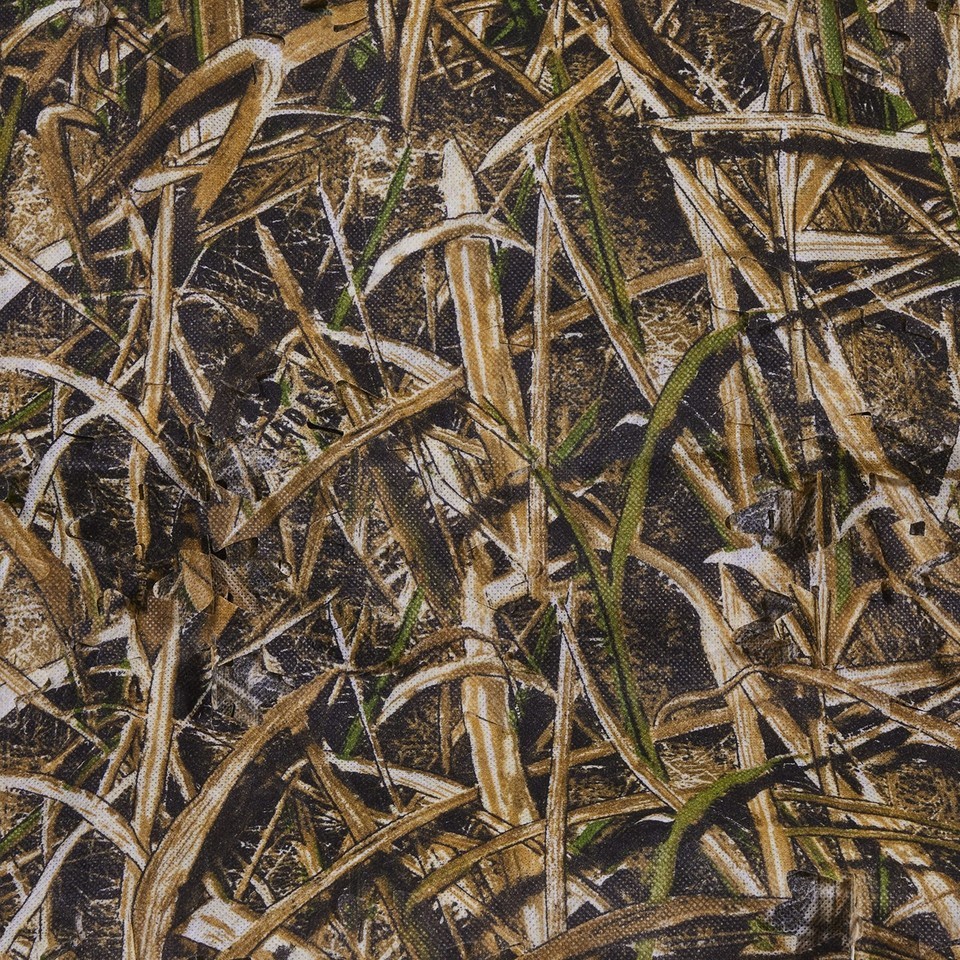 Die-cut leafy non-woven material imitates natural surroundings. Easy to manipulate, cut, or alter to fit. Die-cut leaves provide natural motion. Mossy Oak Shadow grass Blades camo, great for duck Hunting or goose.