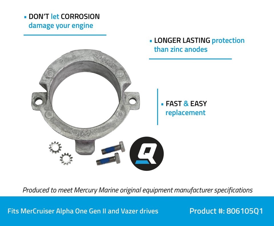 Bearing carrier anode for Alpha One Gen II and Vazer drives. Designed for use in fresh water or salt water to help protect MerCruiser Sterndrive from the harmful effects of galvanic corrosion. Inspect annually and easy to replace. Attaching hardware kit included. The Quicksilver brand is the leader in delivering uncompromising engine oils, parts and accessories to the marine industry for over 65 years. Quicksilver is the premier supplier of Mercury Marine Original Equipment replacement engine parts, oils, and accessories, but also works to serve all Original Equipment brands in the marine and powersports industries. It has earned a loyal following by providing the highest quality products that are tested through some of the most rigorous environments and testing procedures. No aftermarket company comes close to the level of research and design as Quicksilver; buying Quicksilver is buying performance, protection and peace of mind.