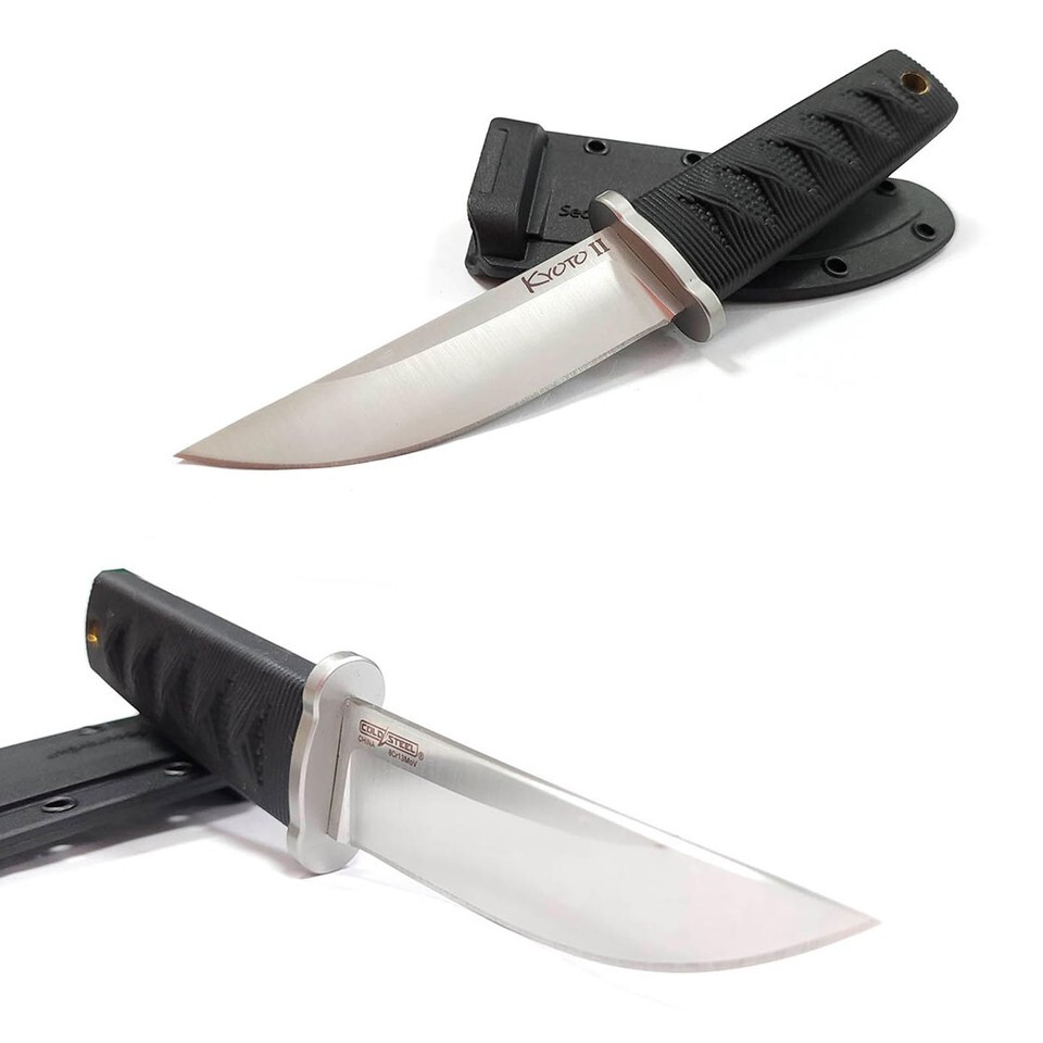 COLD STEEL KYOTO II DROP POINT KNIFE (CS-17DB): The Cold Steel Kyoto II knife is a masterful blend of strength, functionality, and thoughtful design, tailored for hunters and outdoor enthusiasts. Featuring a robust drop point blade with a wide, curved edge, it excels in precision tasks like skinning and gutting while ensuring superior durability through its full-tang construction. Crafted from 8CR13MOV stainless steel, the blade balances hardness and corrosion resistance, retaining its sharp edge even under demanding conditions. Equipped with a high-traction Kray-Ex handle styled after traditional Japanese sword grips, the Kyoto II delivers a secure and comfortable hold, combining classic aesthetics with modern practicality. The knife includes a slim, versatile sheath that supports multiple carry options, from a bead chain lanyard to a Cold Steel C-Clip, ensuring convenience and accessibility in any situation. Weighing just 3.2 oz with a 3mm thick blade, a handle length of 3 3/8 inches, and an overall length of 6 3/4 inches, this fixed-blade knife is compact yet mighty, ready to tackle any outdoor challenge.
