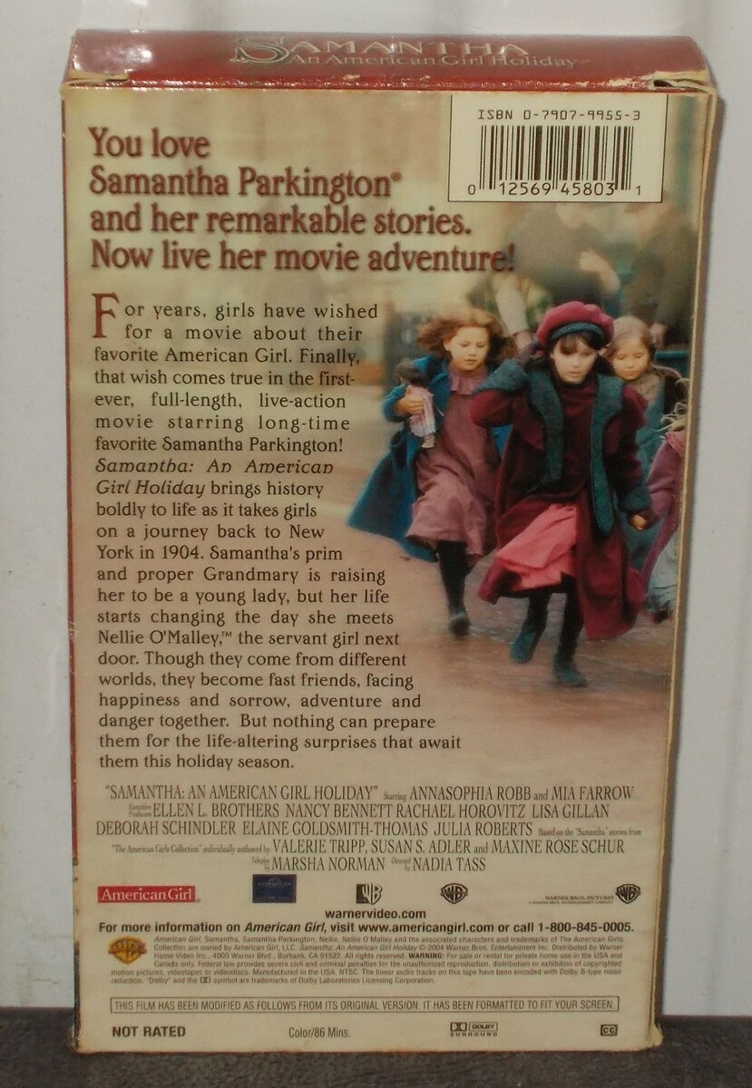 The tape features Samantha: An American Girl Holiday, starring Annasophia Robb and Mia Farrow. It tells the story of Samantha in 1904, her proper upbringing with her Grandmary, and her friendship with Nellie O'Malley, the servant girl next door. A perfect holiday watch for American Girl fans and VHS collectors!