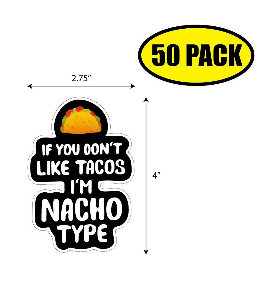 This listing is for a 50 pack of 4" x 2.75" 'IF YOU DON'T LIKE TACOS I'M NACHO TYPE decals.