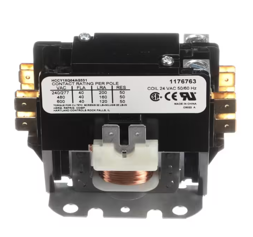 Choose the International Comfort Products 1176763 40A 1 Pole Contactor for reliable HVAC system control and long-lasting performance. Its 24V coil compatibility, 50/60Hz operation, and heavy-duty 40 Amp capacity provide consistent switching, helping reduce downtime and ensure safe, efficient operation of your heating and cooling equipment
