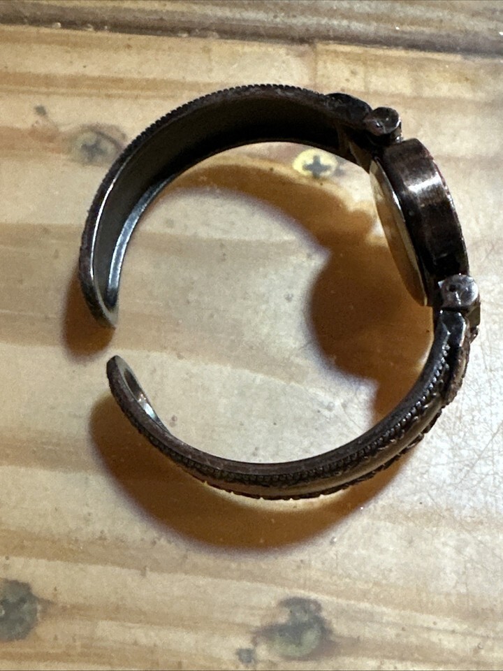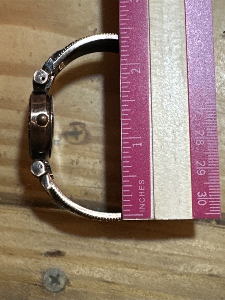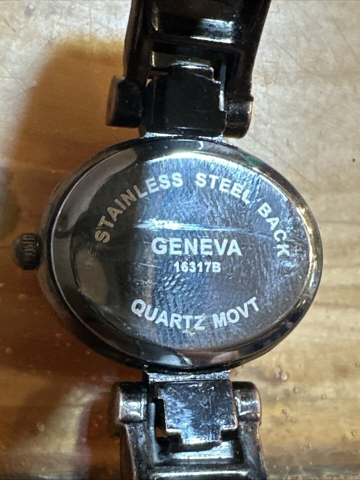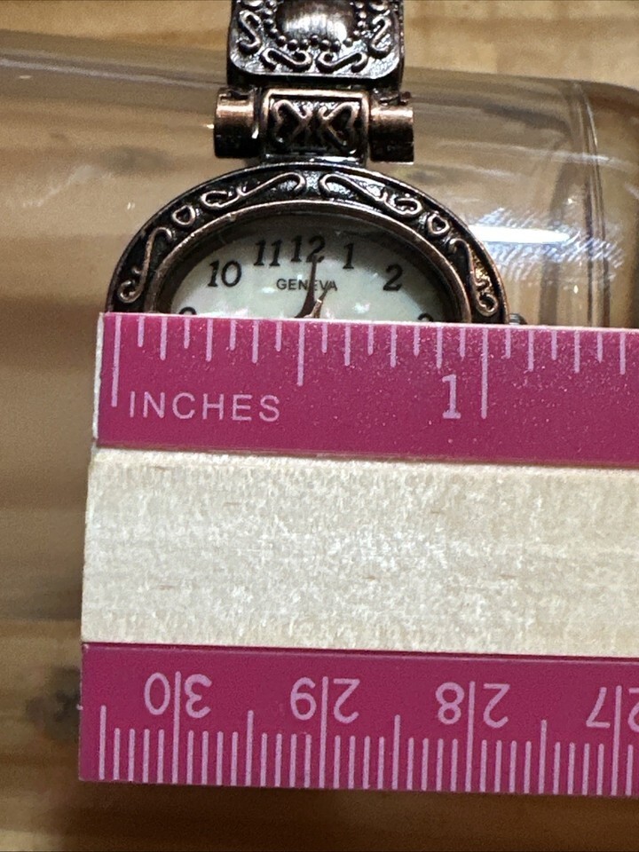 Works just installed a new battery. This Geneva Watch for women features a bronze bangle band with a hinge, making it easy to wear and stylish. The watch has a white pearl dial with Arabic numerals, perfect for a classic yet elegant look. With a quartz movement and water-resistant feature, this oval-shaped wristwatch is suitable for both formal and casual occasions. The watch comes with a snap caseback and is made of bronze, adding a touch of sophistication to any outfit.