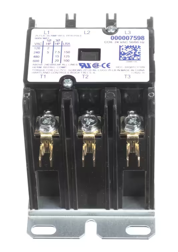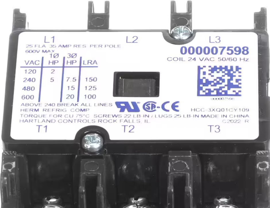 The Multiplex 000007598 Contactor is a dependable 3 Pole contactor featuring a 24VAC 50/60Hz coil, rated at 25 FLA and 35A RES, designed for reliable electrical switching in commercial beverage and foodservice equipment. Engineered to control compressors, motors, and heating components with precision, this contactor ensures stable engagement and consistent operational performance. Built for durability in demanding environments, it is an essential replacement part to maintain safe and efficient equipment functionality.